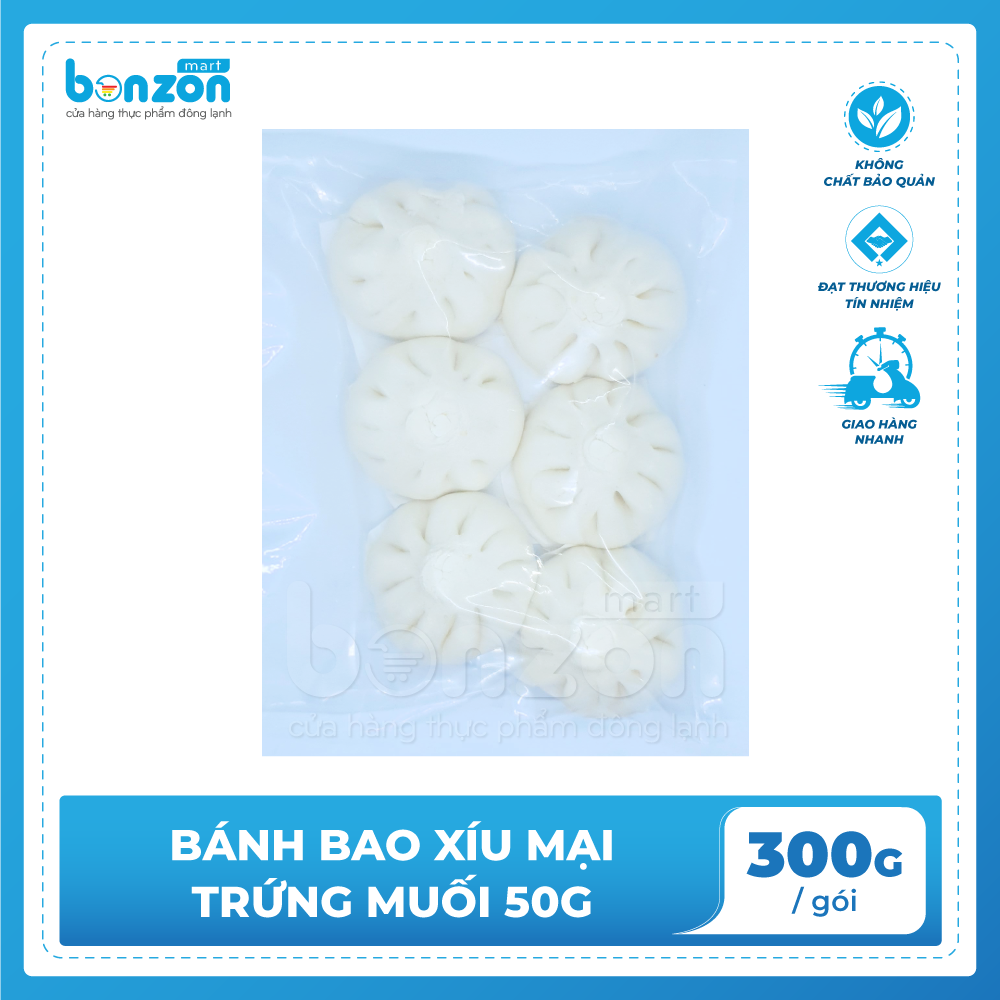 Với sản phẩm tươi sống, trọng lượng thực tế có thể chênh lệch khoảng 10%. ĐỊNH LƯỢNG: 50g/cái x 6 cái/gói THÀNH PHẦN: Vỏ bánh bao. Nhân: thịt heo, trứng vịt muối, hành tím, hành