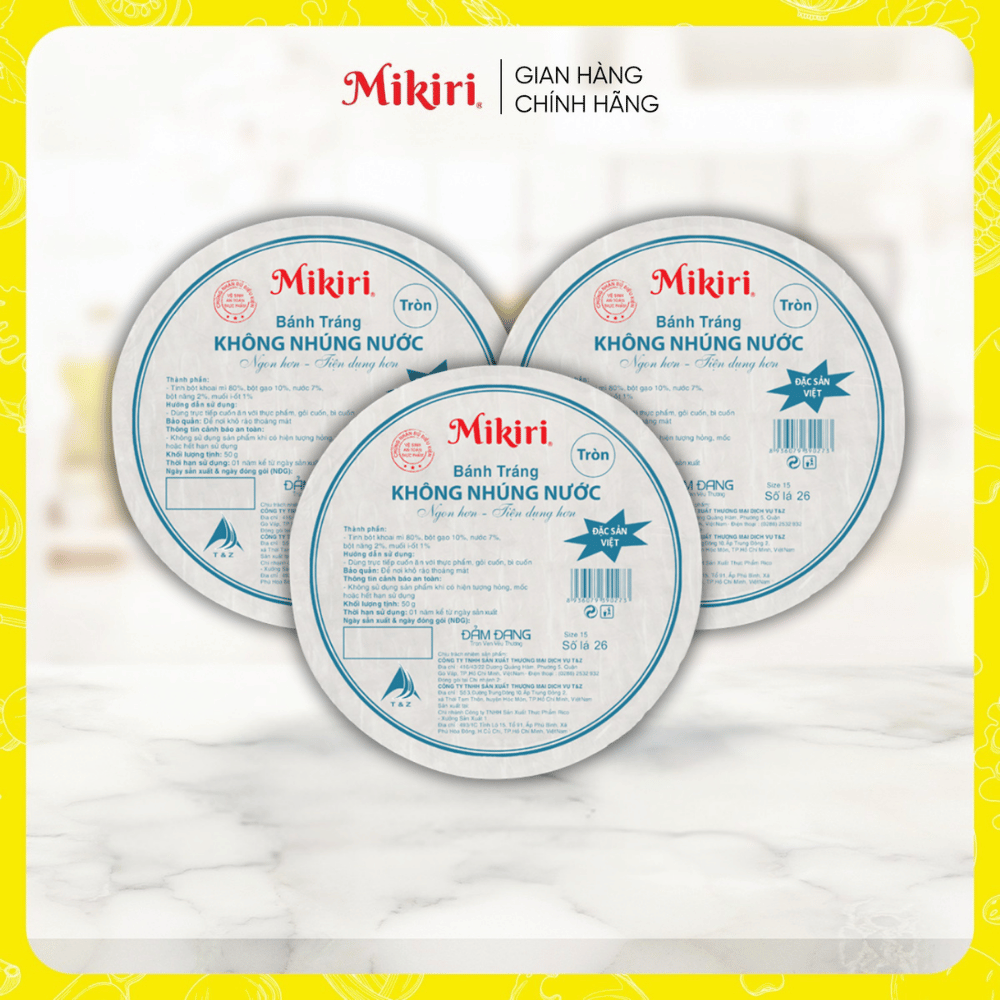 Bánh tráng tròn Mikiri không nhúng nước size lớn nhỏ - tiện lợi - ăn liền Combo lựa chọn Với thành phần của bánh tráng gồm: tinh bột, khoai mì và muối. Dùng làm gỏi cuốn, bì cuốn. Không phải nhúng nước khi sử dụng, lá bánh mềm và dẻo.