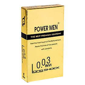 Mua tại TiktokBao cao su chống xuất tinh sớm siêu mỏng Power Men 0.03 Invi Long Shock Với ưu điểm vượt trội : siêu mỏng 0.03mm, Power Men 0.03 Invi Long Shock là sản phẩm bao cao su chống xuất tinh sớm mỏng nhất thế giới hiện có trên thị trường, độ mỏng chỉ 0.03mm giúp truyền nhiệt cực nhanh, giữ lại cảm giác chân thật nhất cho cả hai bạn. Sản phẩm được sản xuất và kiểm nghiệm chặt chẽ theo tiêu chuẩn ISO9001, đảm bảo được độ bền qua các bài kiểm tra về sức chịu nén, kéo giãn theo đúng tiêu chuẩn như các loại bao cao su thông thường.