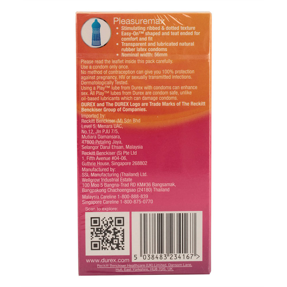 - Hạn sử dụng: xem trên vỏ bao bì. Bao cao su gai nhỏ Durex Pleasuremax kích thích tăng hưng phấn. Đặc điểm nổi bật của Durex Pleasuremax:
