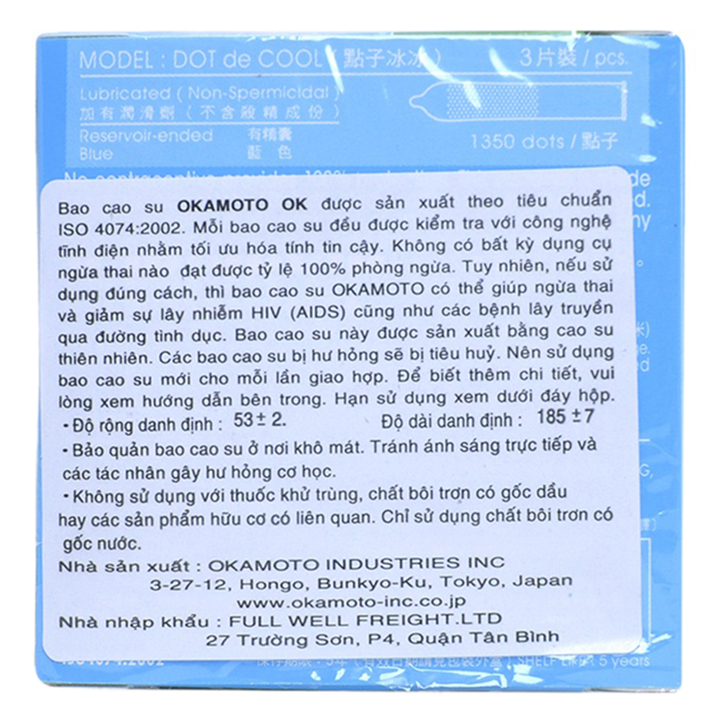 Bao Cao Su Okamoto Dot Cool (Hộp 3 Gói) - Cuộc sống tình dục của bạn rất quan trọng. Tình dục là bản năng và nhu cầu tự nhiên của con người, ngoài chức năng duy trì nòi giống thì đời sống tình dục viên mãn còn mang nhiều lợi ích cho sức khỏe. Vì vậy bạn cần hiểu rõ về cấu trúc tình dục của cơ thể mình, các phương pháp tránh thai thích hợp và nhất là các bệnh lây nhiễm qua đường tình dục để bảo vệ cho chính mình. Bao cao su là một lựa chọn tối ưu, mang lại hiệu quả cao trong phòng tránh các bệnh lây lan qua đường tình dục và ngừa thai hiệu quả khi sử dụng đúng cách. Đó là phương pháp tối ưu để giúp cho bạn gia tăng đời sống tình cảm và đạt hiệu quả an toàn nhất.