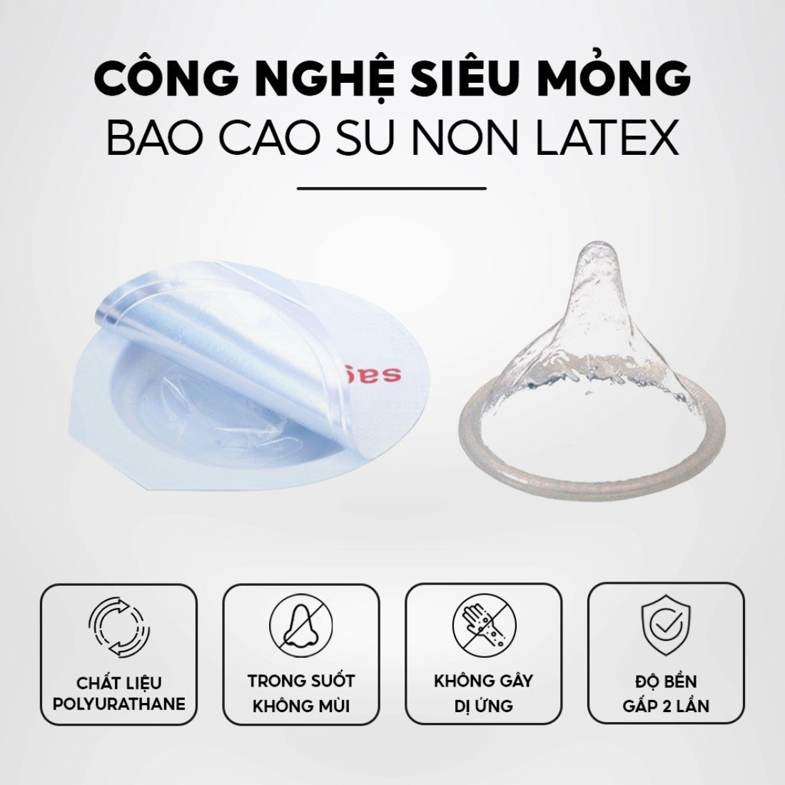 Mô Tả Sản Phẩm Làm từ Polyurethane trong suốt, không mùi Độ bền cao hơn gấp 2 lần bao cao su thông thường, chịu lực kéo tốt hơn gấp 3 lần. Có một sợi dây