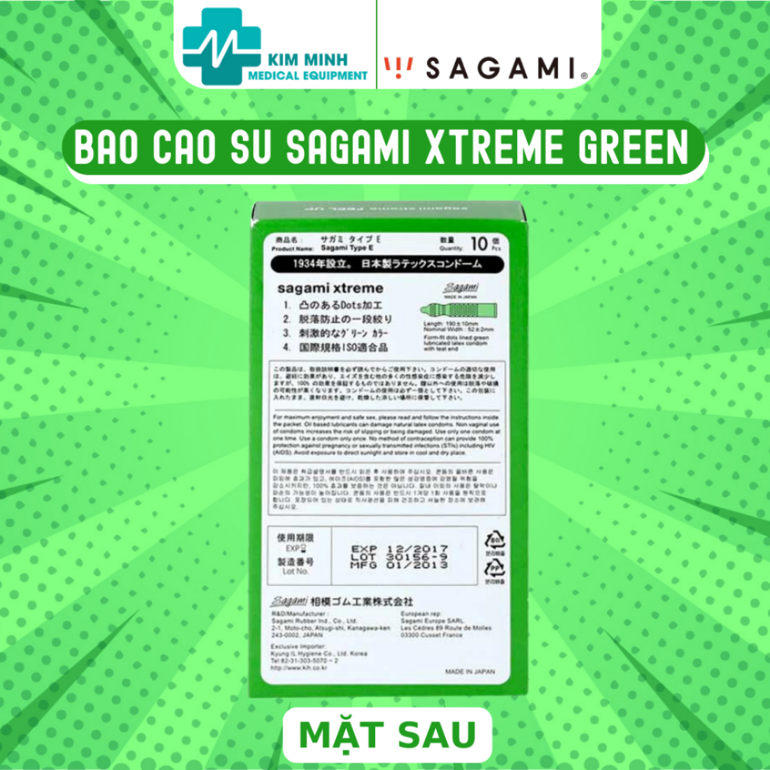 Bao cao su Sagami Green là dòng sản phẩm có gân, gai, một lần thắt, nhiều chất bôi trơn của Sagami – Nhà sản xuất bao cao su đầu tiên tại Nhật Bản.