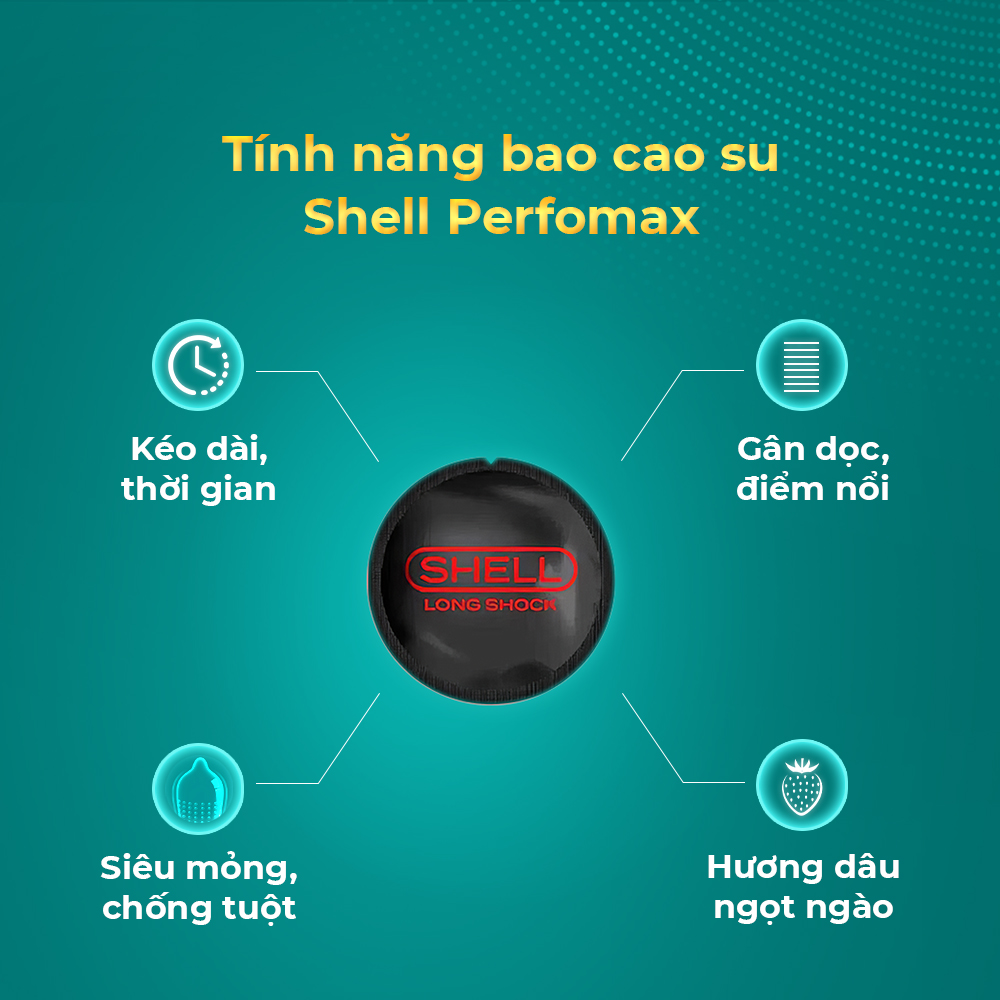 Đặc điểm: Phụ kiện kéo dài thời gian, tăng kích thước với 12 bi silicon siêu mềm, an toàn, kèm theo đó là 1 chiếc bao cao su Shell Performax 6 tính năng: Kéo dài thời gian, gân, điểm nổi, nút thắt chống tuột, siêu mỏng, hương dâu.