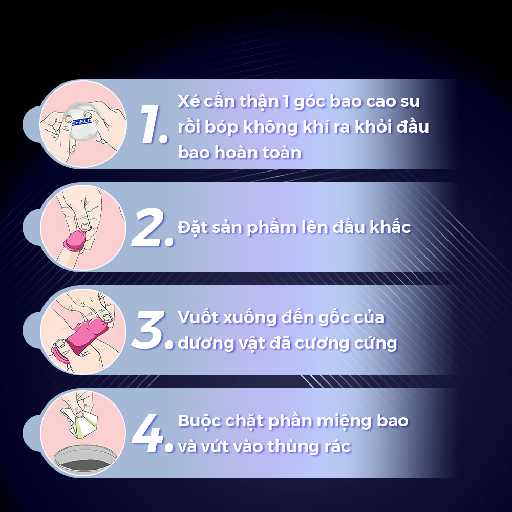 ✪ Cách dùng: Bạn tiến hành xé một góc nhỏ trên vỏ bao cao su. Sau đó, hãy dùng tay bóp phần đầu bao để đuổi hết không khí bên trong ra ngoài. Tiếp đến, bạn đặt bao cao su lên trên đầu khấc và kéo xuống dưới gốc. Sau khi quan hệ xong, bạn nhẹ nhàng rút bao ra, buộc chặt phần miệng bao và cho vào thùng rác.