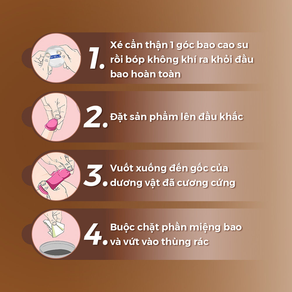 ✪ Cách dùng: Cẩn thận xé 1 góc bao cao su rồi bóp không khí ra khỏi đầu bao, sau đó đặt bao vào đầu "khủng long con" đang cứng rồi vuốt xuống đến gốc. Sau khi quan hệ xong giữ đầu bao rồi từ từ rút "khủng long con" ra tránh làm tràn tinh dịch. Thắt miệng bao rồi vứt vào thùng rác.