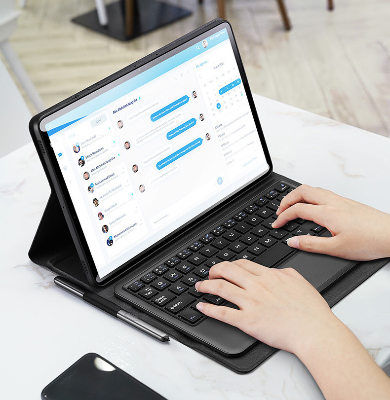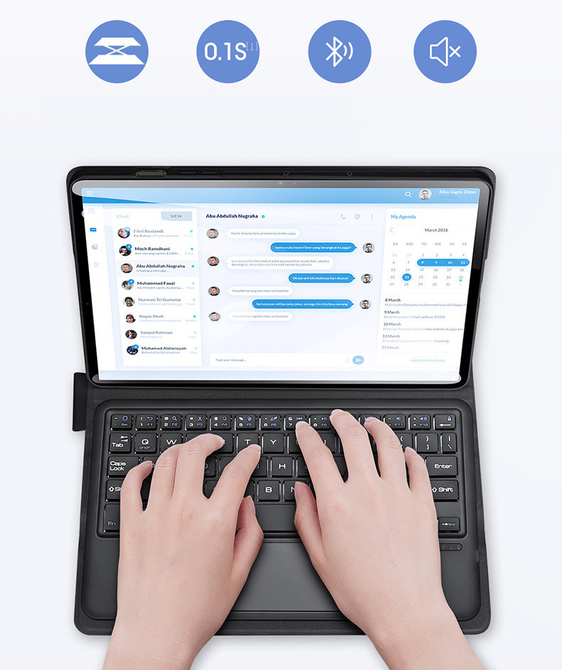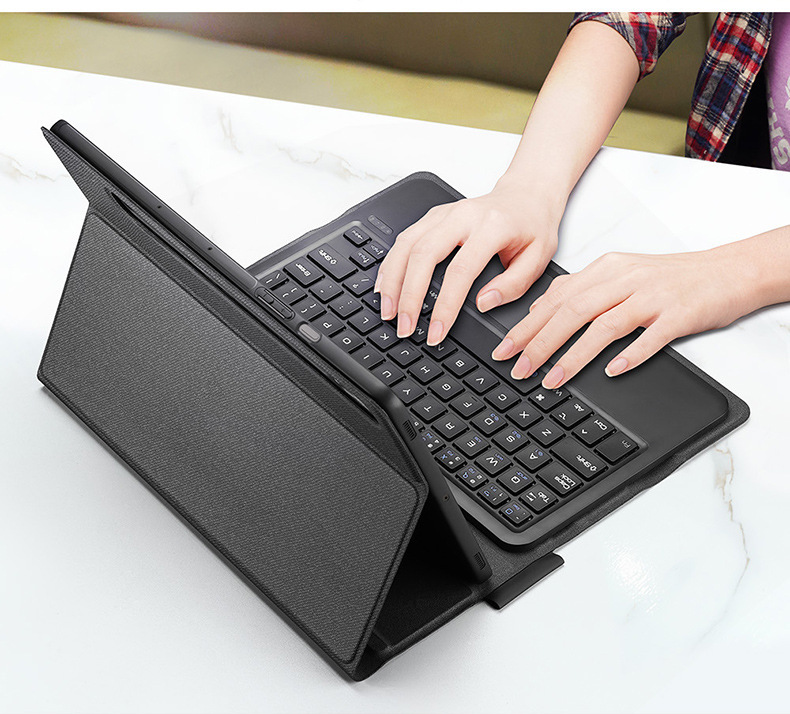 Bao da kèm bàn phím chính hãng Dux Ducis có bàn di chuột TrackPad vừa khít với thân máy và với thiết kế trượt ống kính đã được cấp bằng sáng chế, nó cung cấp khả năng bảo vệ đáng tin cậy cho mặt trước, mặt sau, bốn góc và camera của thiết bị. Vẻ ngoài đơn giản và chất liệu vải PU tinh tế hòa quyện với tính thẩm mỹ của máy tính bảng, nơi nghệ thuật và công nghệ được tích hợp hoàn hảo