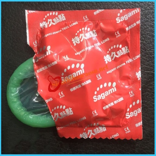 Bao cao su Sagami là dòng bao cao su cao cấp, siêu mỏng, có bi chấm và gân, một lần thắt ôm khít để tránh bị tuột, mầu xanh tươi mát, có chất bôi trơn