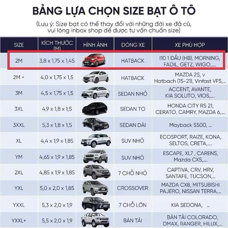 - Size 3M (4,5 x 1,75 x 1,5): AVEO, GENTRA, LACETI EX , CX3,FIESTA SD, FORCUS HB, SD, LASER, CITY,ACCENT, AVANTE, ELANTRA (10-14),CERATO/FORTE (09-13), RIO SD,SOLUTO, SPECTRA, MAZDA 2 SD (15-21),MAZDA 323, MAZDA 3 (03-09), .... 3XL (4,9 x 1,8 x 1,5) 4 chỗ :CITY RS (21-23) , BMW 320i, NUBIRA, MONDEO, ACCORD, CIVIC ( 17-23) ELANTRA (15-21), CERATO (13-21), MERC C (10-21), MERC E 2010 , MAZDA 3 SD, HB (15-21), MAZDA 6 TEANA, ALTIS (14-21), CAMRY, LUX A, SONATA, OPTIMA MAZDA CX30, LEXUS IS 250, AVALON, CRUZE, LACETI CDX K3 , FORCUS SD, mg5