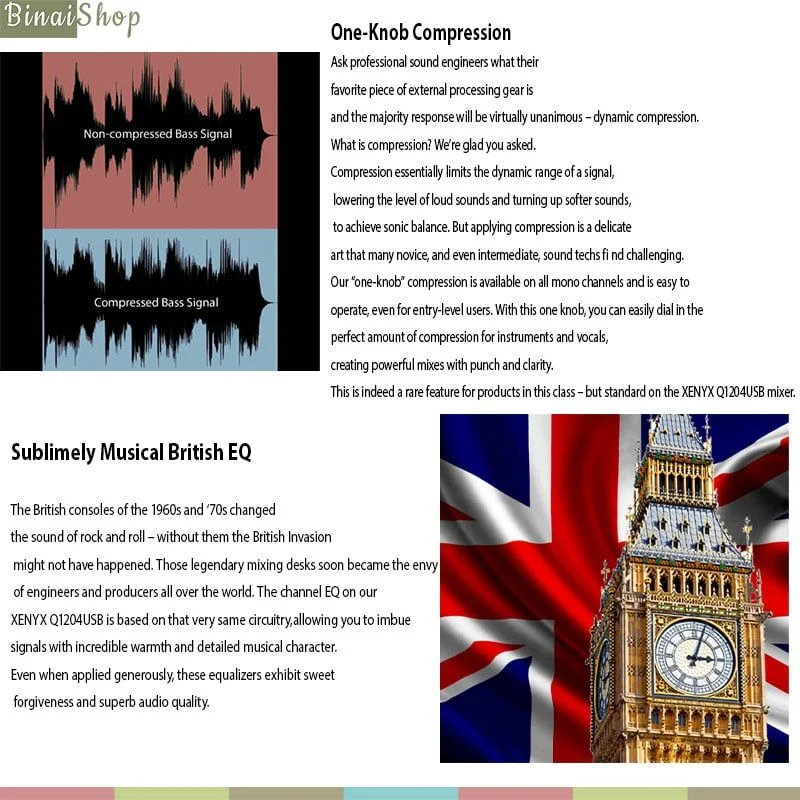 Mua tại Tiktok- Bộ khuếch đại âm thanh Behringer XENYX Q1204USB được tích hợp 12 cổng vào với 4 mic pream XENYX, bộ nén Compressors và Mạch điện Equalizer giống với các bàn mixer của Anh. Hỗ trợ kết nối USB/Auido interface. TÍNH NĂNG CƠ BẢN - Mixer Behringer XENYX Q1204USB có thiết kế 12 cổng vào với tỉ lệ tiếng ồn cực thấp, đầu trộn headroom hiệu suất cao.