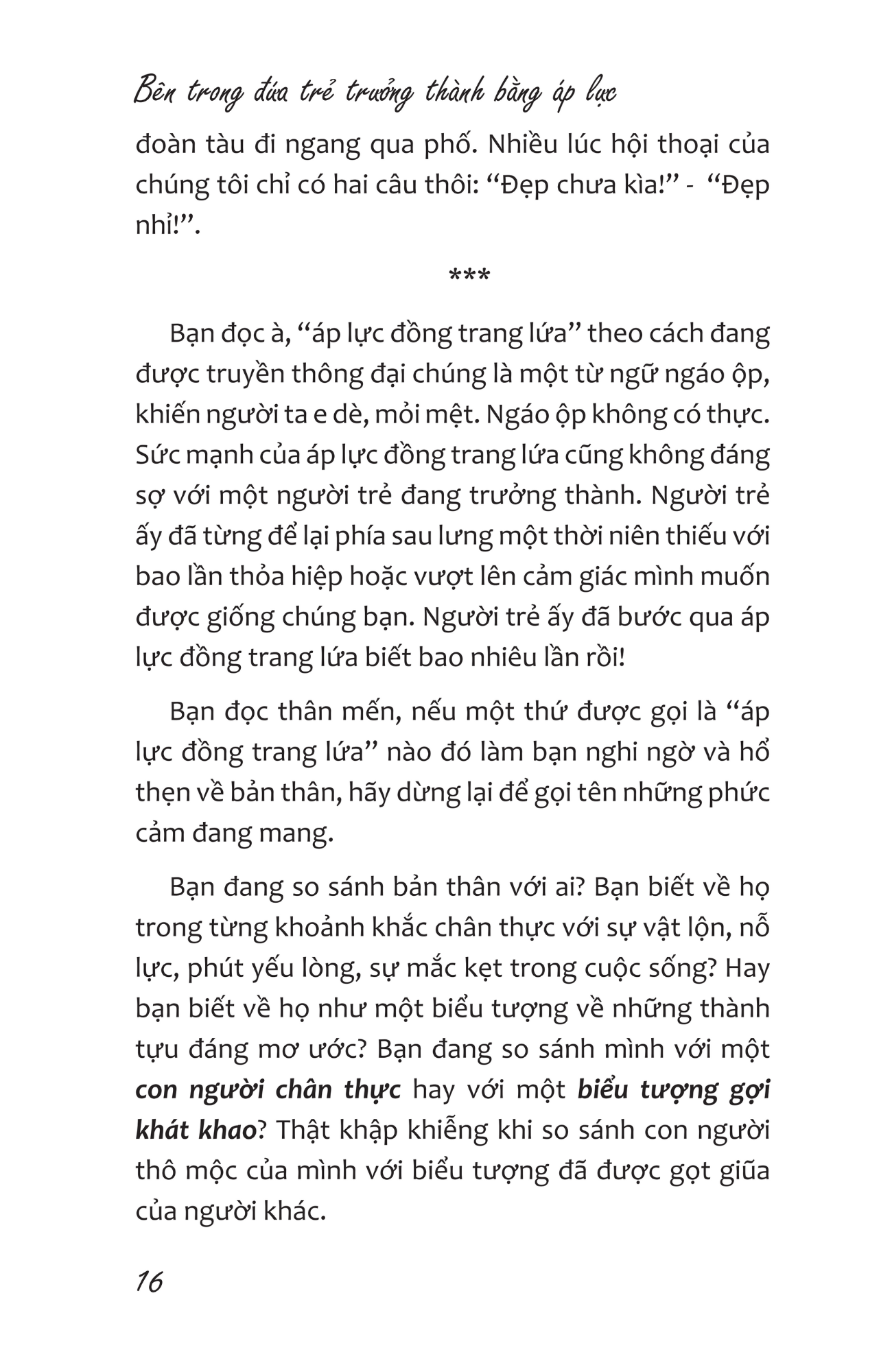 "CHỮA LÀNH" TRỞ NÊN THỜI THƯỢNG, CÓ PHẢI NGƯỜI TRẺ CHÚNG TA ĐANG QUÁ YẾU ĐUỐI? Dạo gần đây nội dung mạng xã hội tràn ngập nội dung lên án thế hệ trẻ bây giờ thật yếu đuối, sơ hở là đòi “chữa lành”, động chút là “tổn thương. Thế nhưng có mấy ai nhìn thấu những áp lực mà người trẻ đang gồng gánh trên vai? Trong cuốn sách “Bên trong đứa trẻ trưởng thành bằng áp lực”, tiến sĩ Tâm lý học Đặng Hoàng Ngân đã bóc tách cho chúng ta những áp lực đang đè nặng trên vai người trẻ. Trong thời đại số này, khi mà mạng xã hội tràn ngập những tấm gương “con nhà người ta”: Cô gái GenZ kiếm tiền tỷ mỗi tháng, chàng trai mua nhà trước tuổi 25, Liệu chúng ta có thể không ngạt thở trước những: áp lực đồng trang lứa, áp lực tuổi tác, áp lực giới tính, và cả những áp lực không tên từ sự kỳ vọng của bố mẹ, của chính m.ình? “Bên trong đứa trẻ trưởng thành bằng áp lực” là hành trình khám phá thế giới nội tâm của những người trẻ. Hành trình ấy đầy hỗn loạn bởi những trăn trở, những dằn vặt, những cuộc chiến nội tâ Bằng kiến thức, kinh nghiệm nhiều năm nghiên cứu, giảng dạy và tham vấn tâm lý, tiến sĩ Đặng Hoàng Ngân sẽ dẫn dắt bạn đọc hiểu sâu sắc về thế giới ấy, để bạn nhận ra rằng: