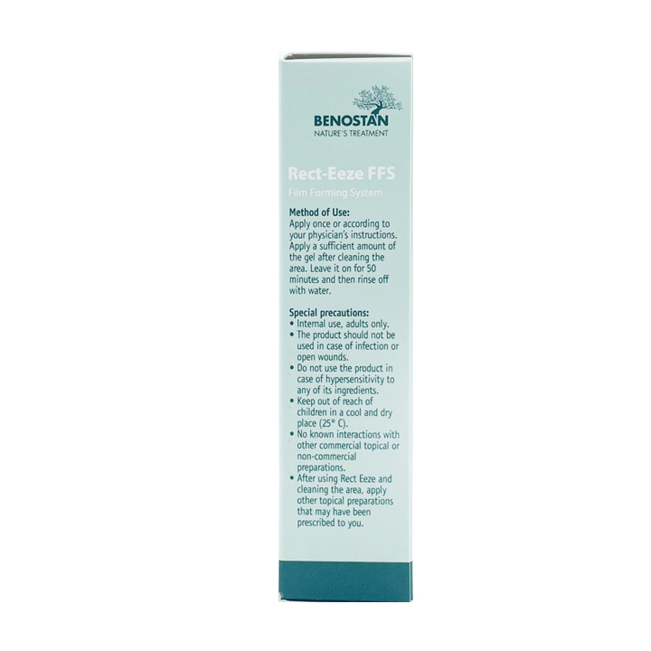 Benostan Nature's Treatment Rect-Eeze FFS (Hộp chứa một tuýp 30 ml, một vòi nhựa) có thương hiệu và được sản xuất bởi Benostan Health Products S.A., có nguồn gốc từ Hy Lạp. Tên sản phẩm: Hệ thống tạo màng phim dùng trong kiểm soát tình trạng khô và kích ứng niêm mạc hậu môn Rect-Eeze FFS Thương hiệu: Benostan Xuất xứ: Hy Lạp Thành phần: Nước tinh khiết (Aqua), Natri hyaluronat, L-Arginin, Acetylcystein, Panthenol, Carbomer, Phenoxyethanol, Ethylhexyglycerin, Natri Hydroxid Quy cách đóng gói: Hộp chứa một tuýp 30 ml, một vòi nhựa Hạn sử dụng: 36 tháng. Hạn sử dụng sau khi mở nắp là 12 tháng. Số công bố: 230000552/PCBA-HCM Công dụng: Được dùng để kiểm soát tình trạng khô và kích ứng hậu môn do viêm niêm mạc hậu môn gây ra bởi liệu pháp xạ trị hoặc hóa trị vùng bụng. Sự kết hợp giữa các thành phần: