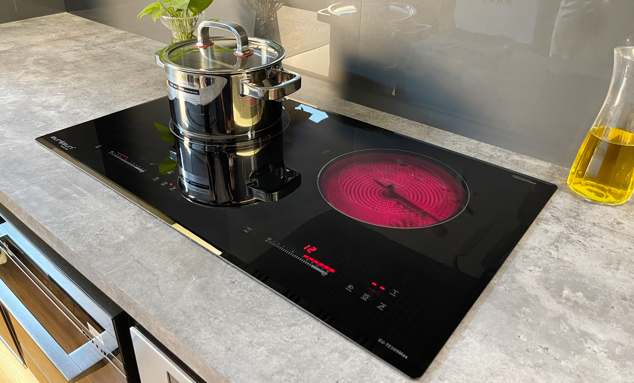 Bếp điện từ kết hợp: 01 điện + 02 từ Mặt kính Crytal siêu bền, chịu lực chịu sốc nhiệt Đầu đốt EGO Made in Germany Chức năng Booster cực nhanh với bếp từ 10