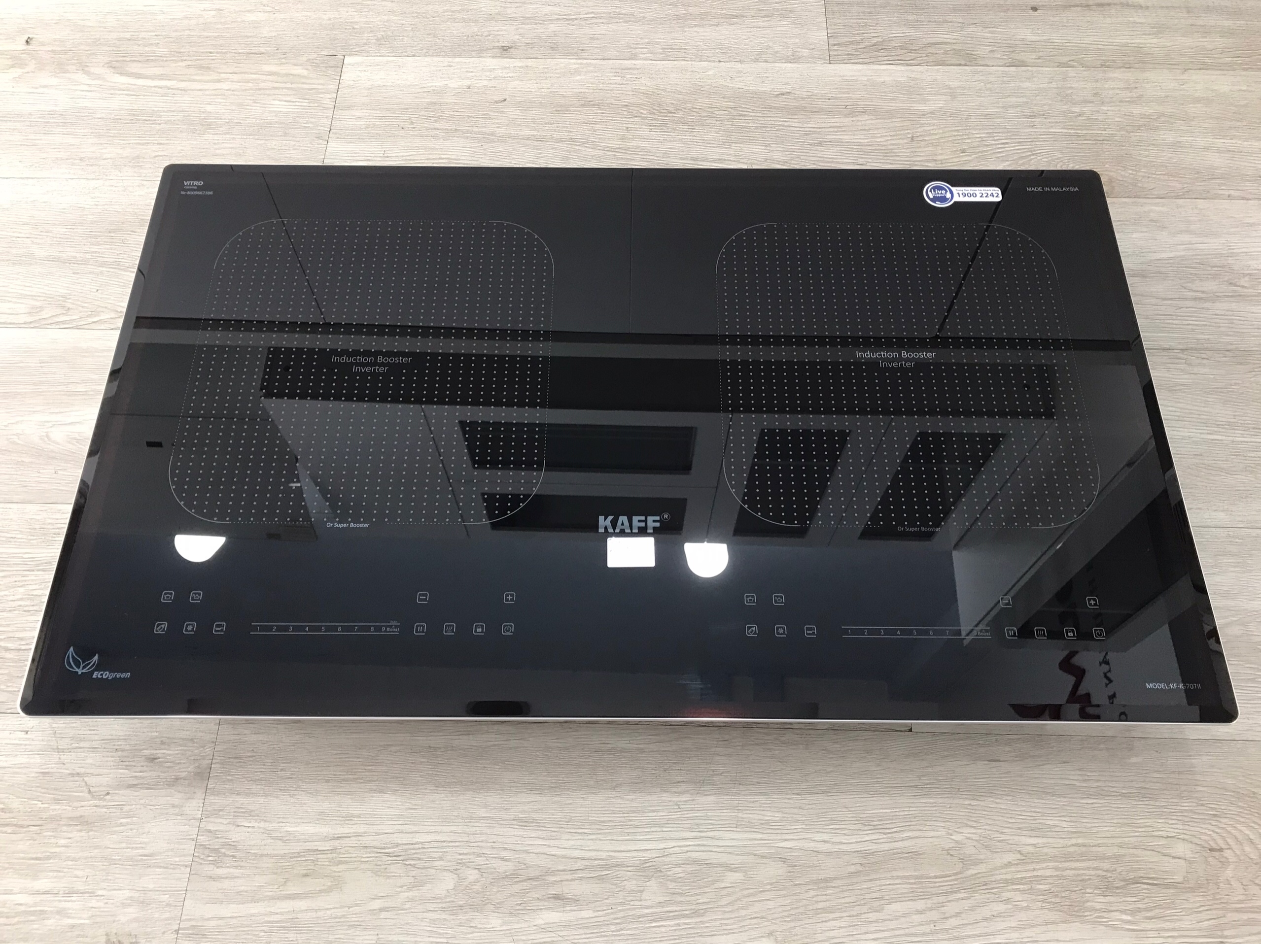 - Chức năng chia sẻ công suất của hai vùng nấu tối đa 4000W: Khi một vùng nấu hoạt động ở mức công suất cao, vùng nấu còn lại sẽ tự động điều chỉnh giảm để đảm bảo tổng công suất bếp không vượt quá 4000W, bảo vệ cho các thiết bị điện khác trong gia đình không bị quá tải đường dây. THÔNG SỐ KỸ THUẬT BẾP TỪ HỒNG NGOẠI KAFF KF-IG707IH Đặc điểm nổi bật Bếp 2 vùng nấu cảm ứng từ Đầu đốt GO made in Germany Công nghệ quạt tản nhiệt Turbo siêu êm chống ồn Công nghệ ECO Green tiết kiệm điện, thân thiện môi trường Mặt kính Vitro Cermic siêu bền, chịu sốc nhiệt lên đến 1000 độ C, bo viền nhôm 4 cạnh sang trọng. Chức năng "Booster" siêu nhanh 10 dải công suất Điều khiển cảm ứng Slide dạng ẩn trực tiếp trên mặt bếp Chức năng inverter và chia công suất tiết kiệm điện năng, bảo vệ bếp. Chức năng nấu cơm, rã đông, hâm sữa Chức năng chiên xào Chức năng tạm dừng Chức năng chống tràn Chức năng an toàn Chức năng tạm dừng khi cần thiết Khóa trẻ em Chức năng tắt tự động tắt bếp khi không có nồi Chức năng chống trào nước Hẹn giờ giới hạn thời gian hoạt động. Bảo vệ quá nhiệt (cảm biến nhiệt độ tích hợp trong từng vùng nấu) Chỉ báo nhiệt dư hiển thị trên vùng nóng Tính năng chia sẻ công suất Thông số kỹ thuật Tổng công suất: 4000W Vùng nấu từ trái: 1800W - Booster 3200W Vùng nấu hồng ngoại phải: Chế độ 2 vòng nhiệt công suất 2200W Nguồn điện: 220V/50-60Hz Kích thước sản phẩm: R730 x S430 mm Kích thước khoét đá: R680 x S390 mm
