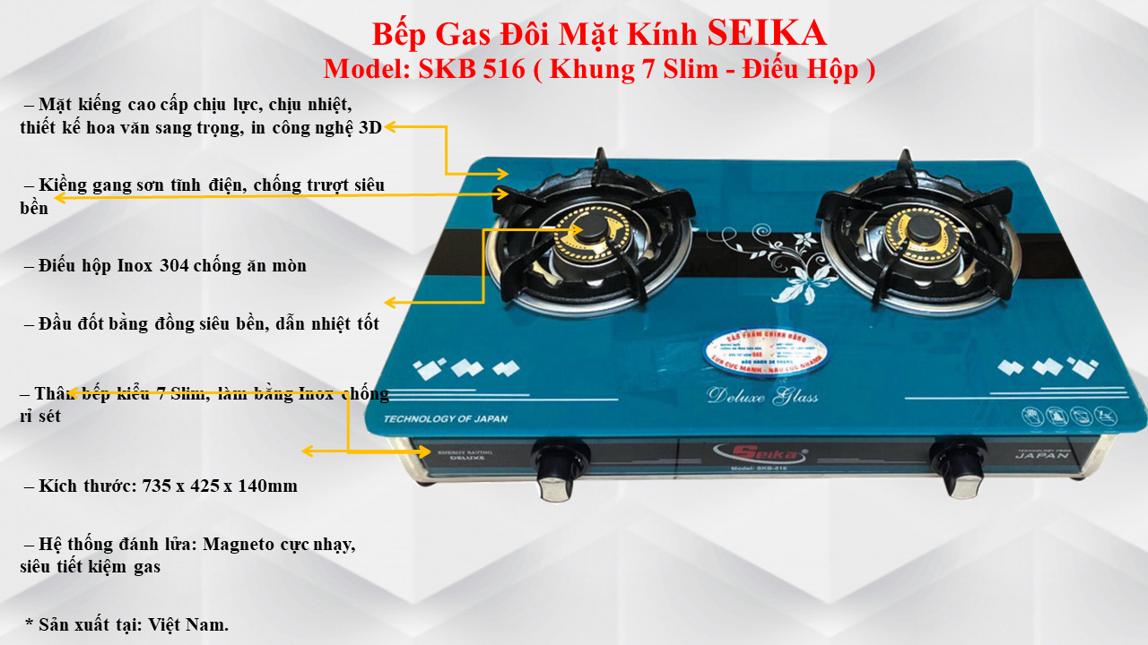 - Bếp Gas Đôi Mặt Kính Sen Đồng Seika SKB516 - Hàng Chính Hãng có thiết kế nhỏ gọn, dễ dàng phù hợp với nhiều không gian bếp, ngoài ra với bề mặt kính luôn sáng bóng, dễ dàng vệ sinh sau khi sử dụng cùng họa tiết và màu sắc nổi bật.