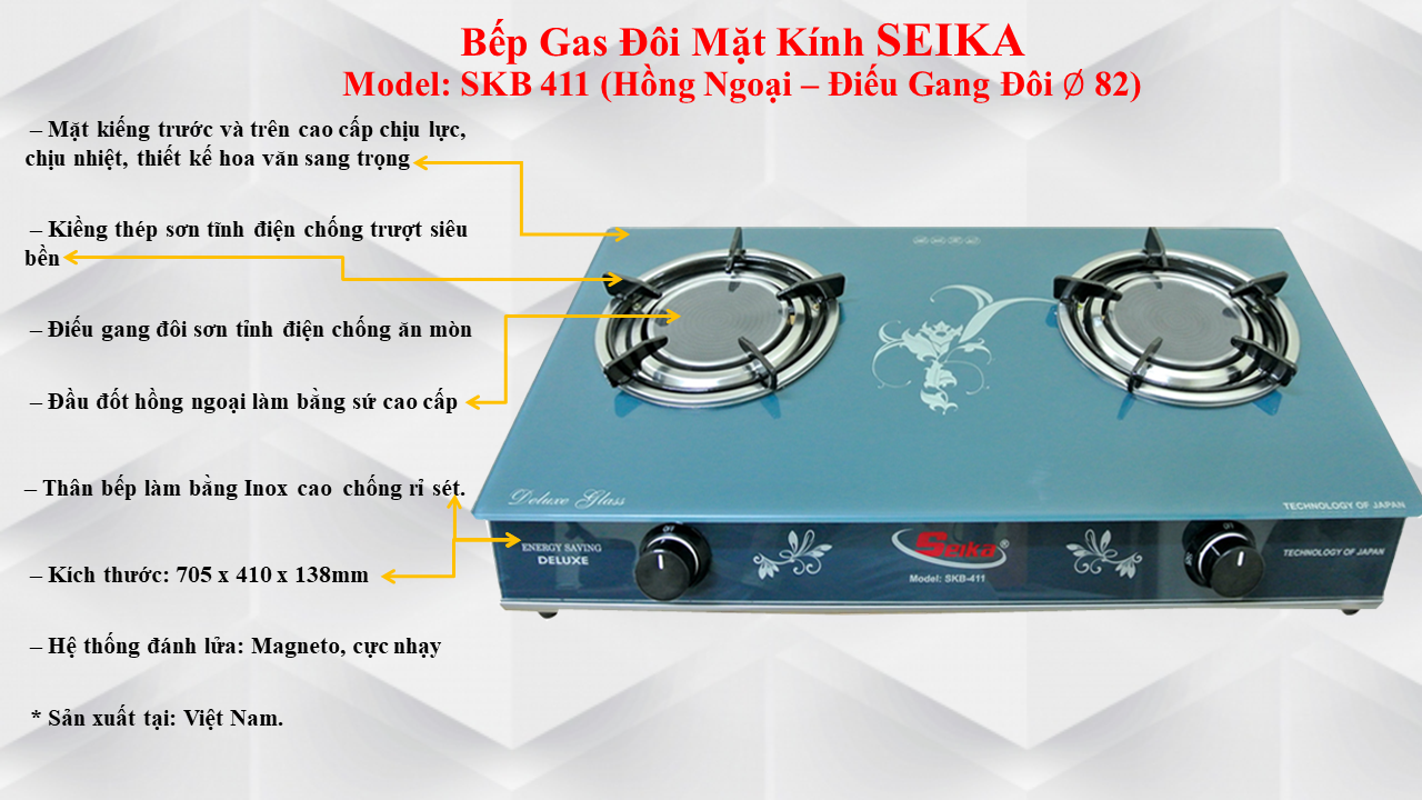 - Bếp Gas Đôi Mặt Kính Sen Hồng Ngoại Seika SKB411 - Hàng Chính Hãng có thiết kế nhỏ gọn, dễ dàng phù hợp với nhiều không gian bếp, ngoài ra với bề mặt kính