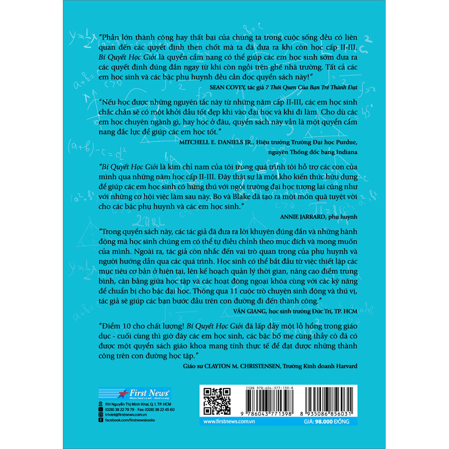 Bí Quyết Học Giỏi Phần lớn thành công hay thất bại của chúng ta trong cuộc sống đều có liên quan đến các quyết định then chốt mà ta đã đưa ra khi còn học cấp II - III. Bí Quyết Học Giỏi là quyển cẩm nang có thể giúp các em học sinh sớm đưa ra các quyết định đúng đắn ngay từ khi còn ngồi trên ghế nhà trường. Tất cả các em học sinh và bậc phụ huynh đều cần đọc quyển sách này!
