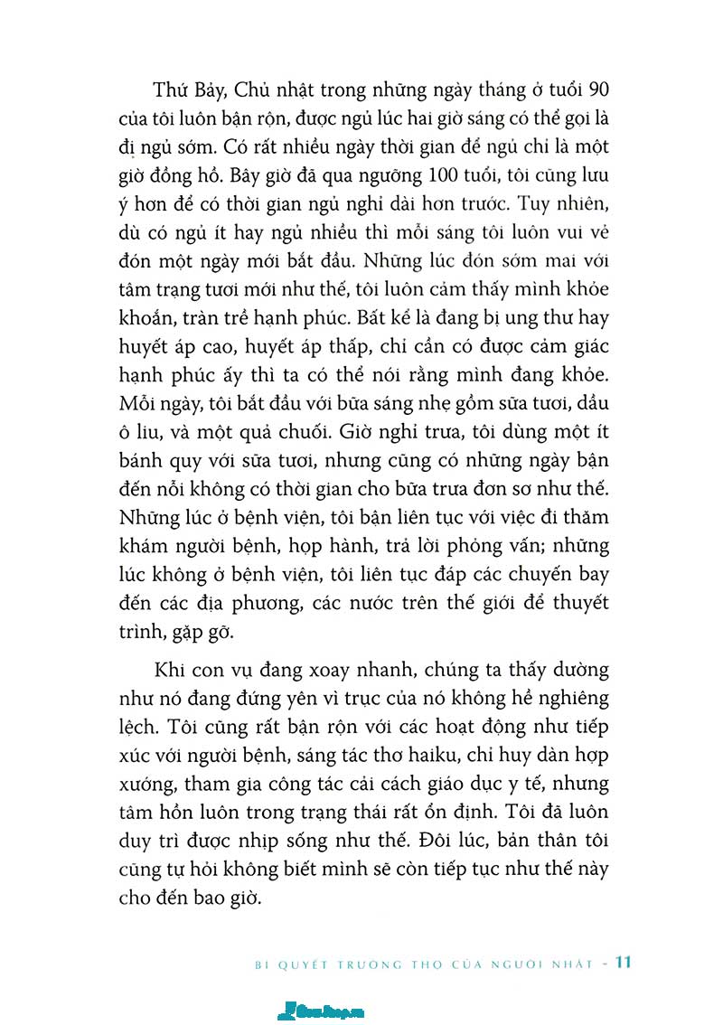 Cố bác sĩ Shigeaki Hinohara sống thọ 106 tuổi và ông vẫn liên tục hành nghề, không nghỉ hưu đến tận ngày 18/7/2016, ngày ông mất. Tựa của quyển sách Bí Quyết Trường Thọ Của Người Nhật có lẽ khiến bạn nghĩ đến việc ông sẽ liệt kê những việc bạn nên làm và không nên làm để có tăng tuổi thọ. Đúng là thế, nhưng quyển sách đặc biệt ở chỗ đó không phải là lý thuyết suông, không phải những lời sáo rỗng mà bạn đôi khi đọc được đâu đó trên mạng, mà đây là những lời khuyên đã được viết bởi một vị bác sĩ già khi bước qua tuổi 90, người đã trải qua những dấu mốc mang tính lịch sử của Nhật Bản và Thế Giới, từng chứng kiến hơn 4000 bệnh nhân giã từ cuộc sống. Đó là tinh hoa từ những kinh nghiệm quý báu khi ông c.hữa ị cho bệnh nhân, khi ông lắng nghe họ và cả từ những sai lầm mà ông đã phạm phải bởi sự hiếu thắng khi còn trẻ của mình.