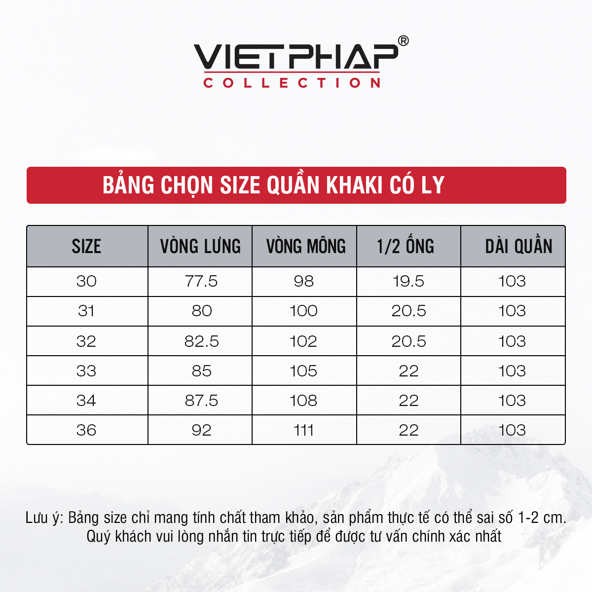 - Bảng size chart chỉ mang tính chất tham khảo, tùy thuộc vào số đo cơ thể mỗi người và chất liệu vải khác nhau sẽ có sự chênh lệch nhất định từ 1 - 2cm.