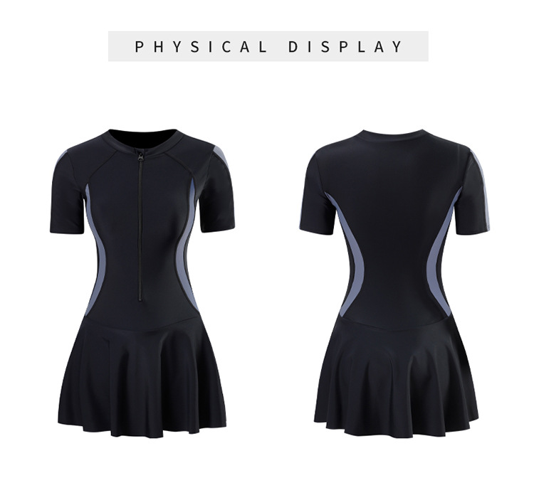 Đồ bơi liền mảnh che bụng thời trang cho nữ Áo có mút sẵn Đen phối xám thanh lịch, Có dây kéo phía trước Có quần đùi liền bên trong váy Chất liệu: Vải thun
