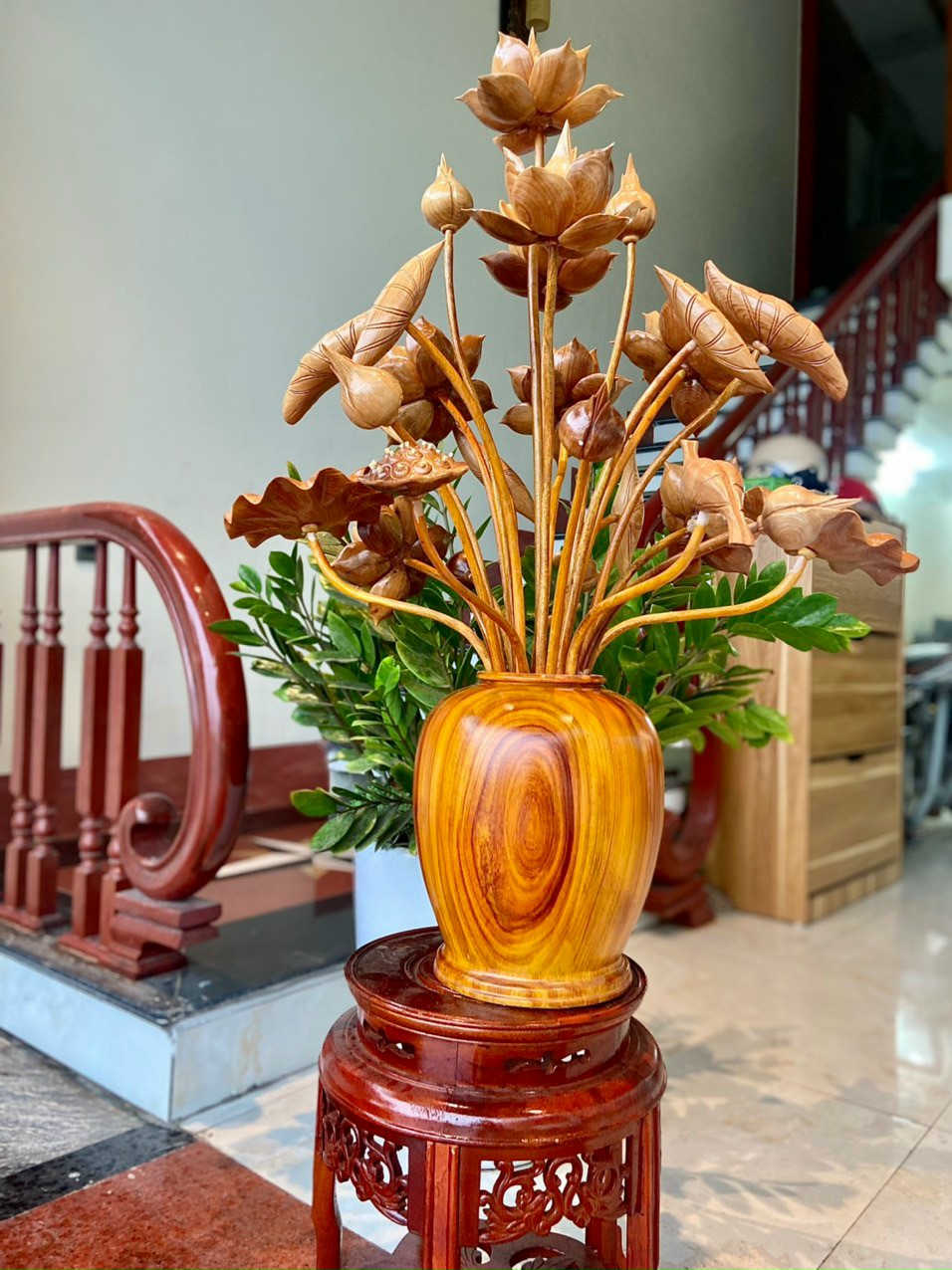 _ Bình hoa sen trang trí phòng khách ,phòng thờ được làm bằng chất liệu gỗ hương đỏ tự nhiên 100%  _ Kt bình cắm 30×25cm ,kt cao tổng kể cả  hoa lá gương 92cm