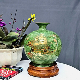 ✨Bình hút tài lộc thuận buồm xuôi gió vẽ vàng 18k men xanh vân đá H25, H30 cm gốm sứ Bát Tràng tặng kèm đế gỗ