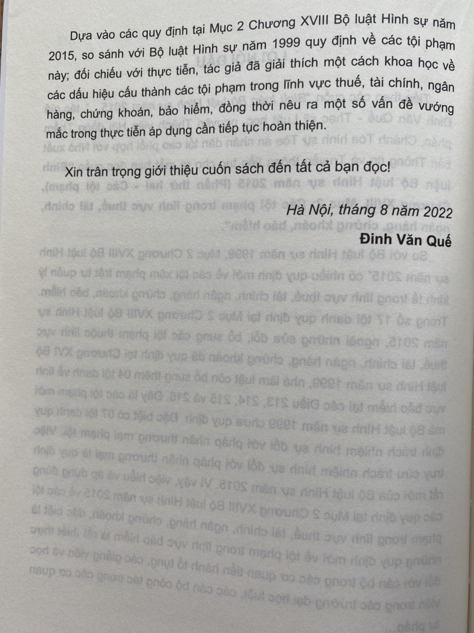 Tiếp theo các cuốn “Bình luận Bộ luật Hình sự năm 2015…”, tác giả Đinh Văn Quế – Thạc sỹ Luật học, nguyên Thành viên Hội đồng Thẩm phán, Chánh Tòa hình sự Tòa án nhân dân tối cao phối hợp với Nhà xuất bản Thông tin và Truyền thông tiếp tục cho ra mắt bạn đọc cuốn “Bình luận Bộ luật Hình sự năm 2015 (Phần thứ hai – Các tội phạm), Chương XVIII, Mục 2: Các tội phạm trong lĩnh vực thuế, tài chính, ngân hàng, chứng khoán, bảo hiểm”.