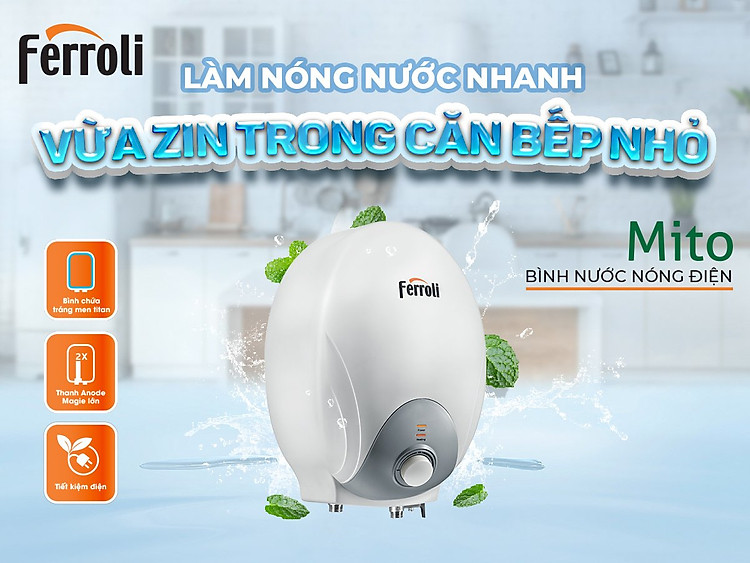 Thông số kỹ thuật bình nóng lạnh Ferroli Mito 6 LDung tích (L) : 6 LítCông suất (W) : 1500Điện thế (V) : 220Nhiệt độ tối đa (⁰C):  75Áp lực nước (Mpa) : 0.8 (+0.05/ -0.1) Phương thức ...