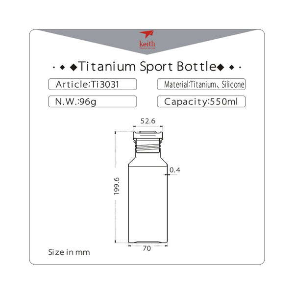 - Chất liệu: Titanium Binh nước Titanium KEITH Ti3031 550ml được làm từ chất liệu titan thân thiện với sinh học, có trọng lượng nhẹ, độ bền và độ cứng cao, thân thiện với môi trường và an toàn, không độc hại, không gây hại cho cơ thể con người và an toàn hơn khi sử dụng lâu dài. Sản phẩm có mã chống hàng giả độc lập, chất lượng đảm bảo. Thiết kế thân nồi tích hợp độc quyền, không hàn trên thân và đáy bình (hiện tại công nghệ này chỉ có ở Kaisi), không có khe hở và không bám cặn. Nắp được ren và trang bị vòng đệm silicon cao cấp tốt cho sức khỏe, kín khí và kín nước. Bình có thể đựng trà, rượu, cà phê, đồ uống và các thực phẩm khác (không dùng chứa nước soda có ga hoặc đồ uống có ga nào để tránh nguy cơ nắp bật ra do giãn nở khí). Đây không phải là ấm đun nước cách nhiệt theo nghĩa truyền thống, vì nó là một lớp duy nhất có độ dày khoảng 0,4MM. Bình làm bằng titan cực kỳ nhẹ và nguyên chất, không có kết tủa có hại ở nhiệt độ cao. Không độc hại và không gây hại cho cơ thể con người. Titan nguyên chất là vật liệu kim loại có thể dùng trong lĩnh vực y tế để cấy ghép vào cơ thể con người, đảm bảo nước đun sôi không chứa BPA hoặc ion kim loại quá mức ở mức tối đa. Trong môi trường tuyết, ấm một lớp titan nguyên chất có ưu điểm hơn so với lớp cách nhiệt hai lớp vì rất nhẹ và có chức năng làm nóng tức thời an toàn. Binh nước được thiết kế ban đầu để đeo ba lô, cắm trại và du lịch, bình nước này cũng thuận tiện dùng ở trường học và văn phòng.