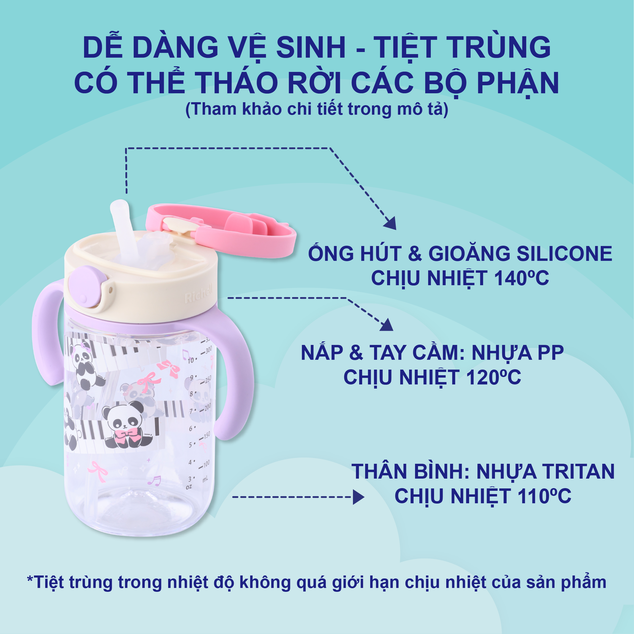 - Ống hút, gioăng, bọc đế: -20°C đến 140°C (silicone) Mỗi bộ phận của sản phẩm được Richell lựa chọn, sản xuất bằng các chất liệu khác nhau vì chúng có các đặc tính phù hợp với yêu cầu sử dụng. Shop không có dịch vụ in/khắc tên lên sản phẩm. ⍣Tiệt trùng: tia UV, hơi nước, trụng nước sôi, dung dịch vệ sinh bình, lò vi sóng (trừ thân bình),...(không quá giới hạn chịu nhiệt). Tất cả các bộ phận của bình đều có thể tháo rời hoàn toàn giúp ba mẹ dễ dàng vệ sinh mọi ngóc ngách. Đảm bảo đồ dùng của bé yêu luôn sạch sẽ, tiệt trùng. ̀ ̂́ ́ ̣̂ ̉ phù hợp với bé từ 6 tháng tuổi. ⍣ Thân bình làm bằng chất liệu ̛̣ (PCT) trong suốt như thủy tinh để mẹ dễ dành quan sát lượng thức uống trong bình. Dễ dàng vệ sinh nhờ phần lòng bình láng mịn. Có vạch chia dung tích thuận tiện cho mẹ theo dõi sức uống của con. ̛̣ - ký hiệu PCT là loại nhựa được đánh giá là một trong những loại nhựa an toàn, không chứa BPA (BPA Free) tức là không chứa các chất gây ung thư hay các thành phần hóa học gây hại đến sức khỏe con người, đặc biệt là trẻ nhỏ. ⍣ Nắp làm bằng chất liệu ̛̣ an toàn khi tiếp xúc với thực phẩm. ̛̣ - ký hiệu số 5 là loại nhựa được các chuyên gia khuyên sử dụng, vì độ bền nhiệt cao và trơ về mặt hóa học, an toàn cho sức khỏe. Nắp mở 2 nấc an toàn. Nút nhấn mở nắp nhẹ nhàng (nấc 1), không bung mở hoàn toàn để tránh nắp bật vào mặt bé, hay khi bé hiếu động bấm nút nghịch thì ống hút vẫn được gập ở đúng vị trí, tránh đổ nước ra ngoài. Khi uống nắp mở tối đa 180°, có khớp khóa giữ nắp để nắp không bị lỏng lẻo, va vào mặt mũi bé khi uống (nấc 2). Ống hút kết hợp với nắp và gioăng giúp chống đổ nước kể cả khi dốc ngược bình hay bé cầm vẫy bình như đồ chơi. Ống hút chất liệu silicone mềm không làm đau nướu bé. Có van chống sặc cho bé giúp điều chỉnh lượng nước bé hút lên mỗi lần bé hút nước sẽ lên một lượng nhỏ vừa đủ, rất an toàn cho bé trong giai đoạn đầu tập uống từ 6 tháng. Chịu nhiệt từ -20°C đến 140°C.