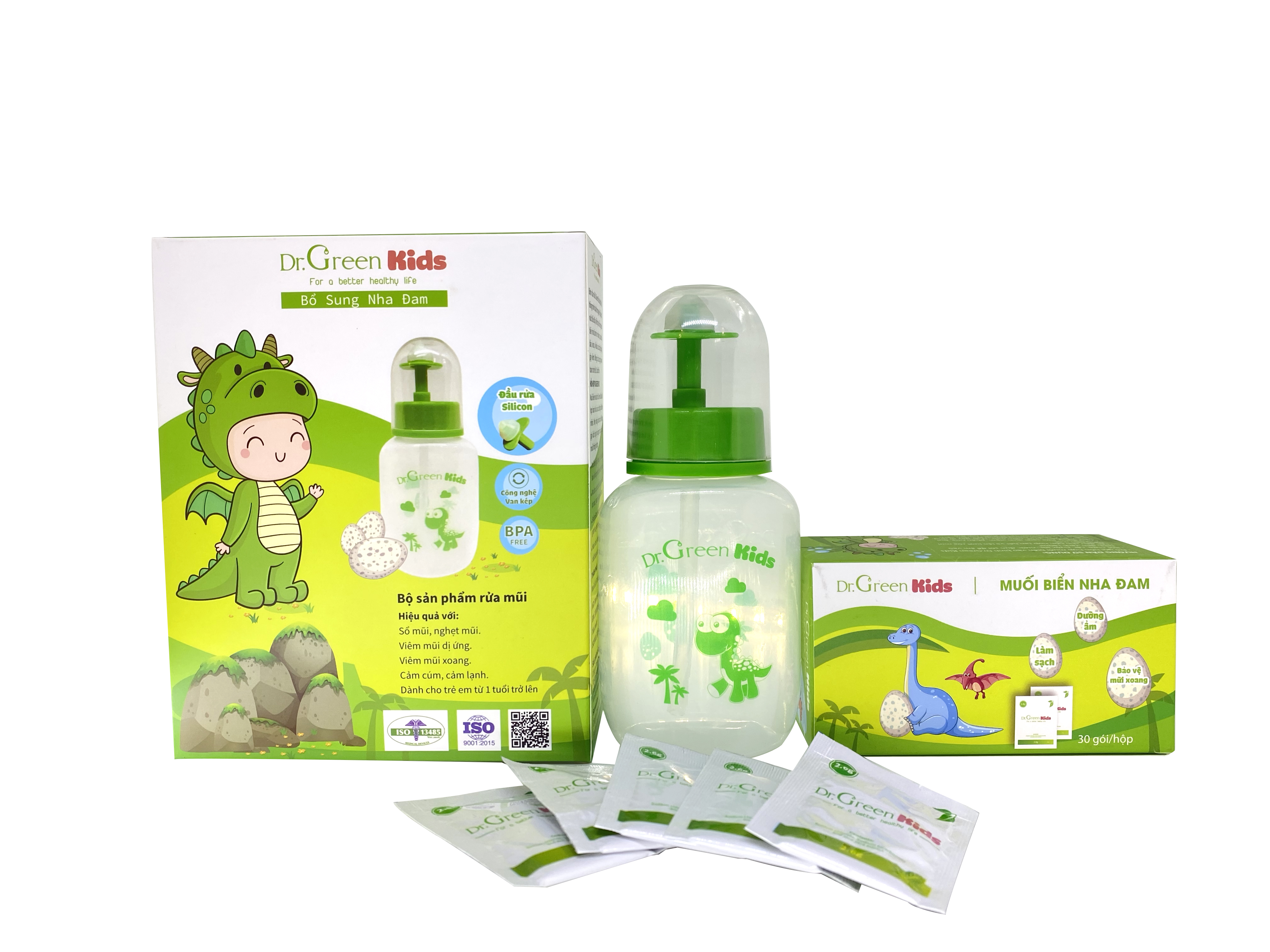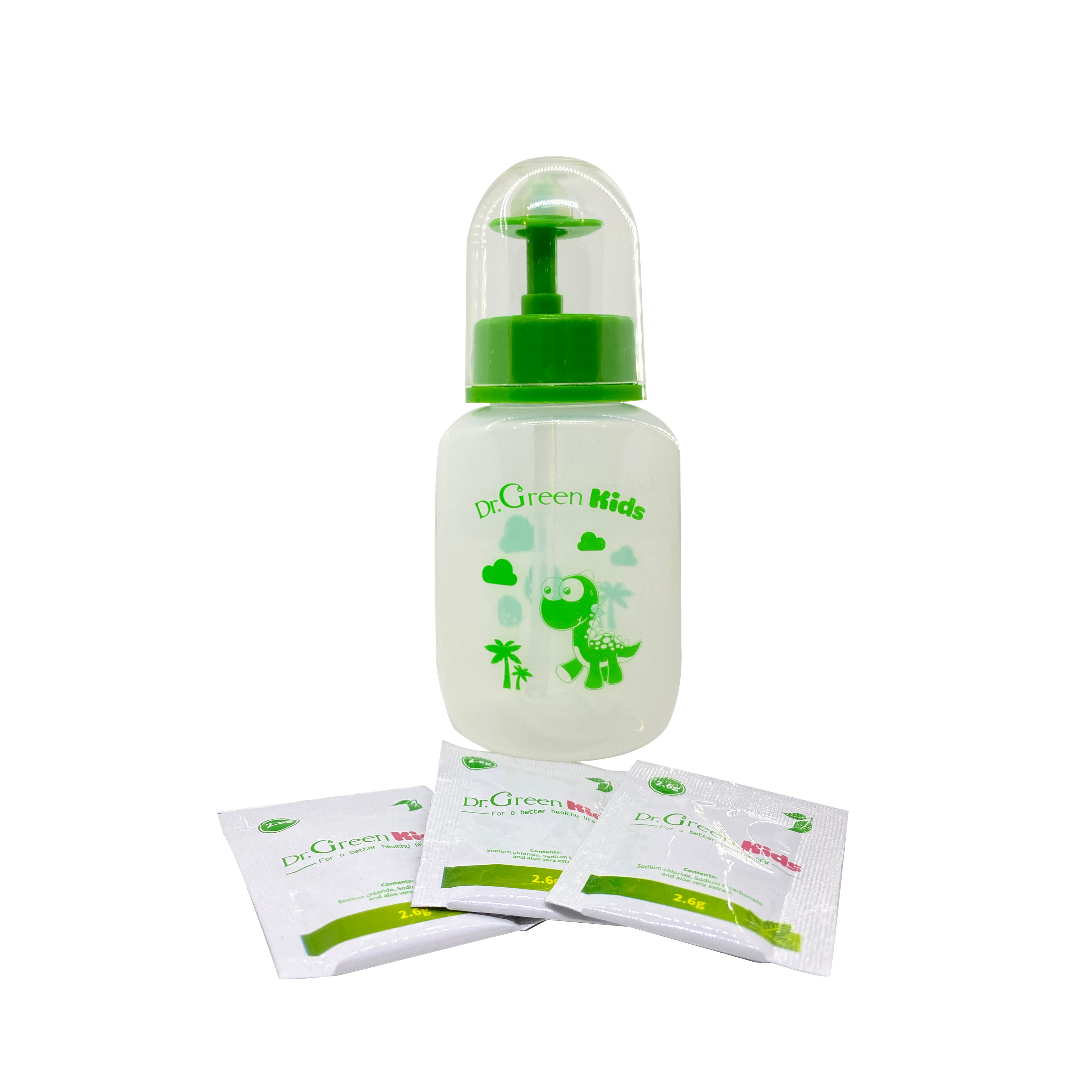 Bình rửa mũi cho trẻ Dr.Green Kids, kèm 30 gói muối rửa mũi, dung tích 180ml, đầu rửa silicon mềm mại, phù hợp rửa mũi với trẻ em