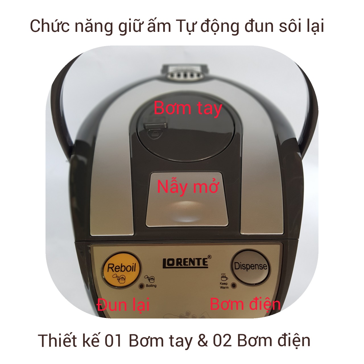 động giữ ấm và tự động ngắt khi cạn nước giúp bạn tiết kiệm được nhiều thời gian để làm những công việc khác mà không cần phải đứng kiểm soát bình như những sản phẩm thông thường. Bình thiết kế 3 cách lấy nước. Lấy bằng bơm tay, Lấy bằng nút bấm trên mặt, và lấy nước tự động rất tiện lợiVạch đo mực nước rõ ràng, khóa trẻ em an toàn Chất liệu cao cấp