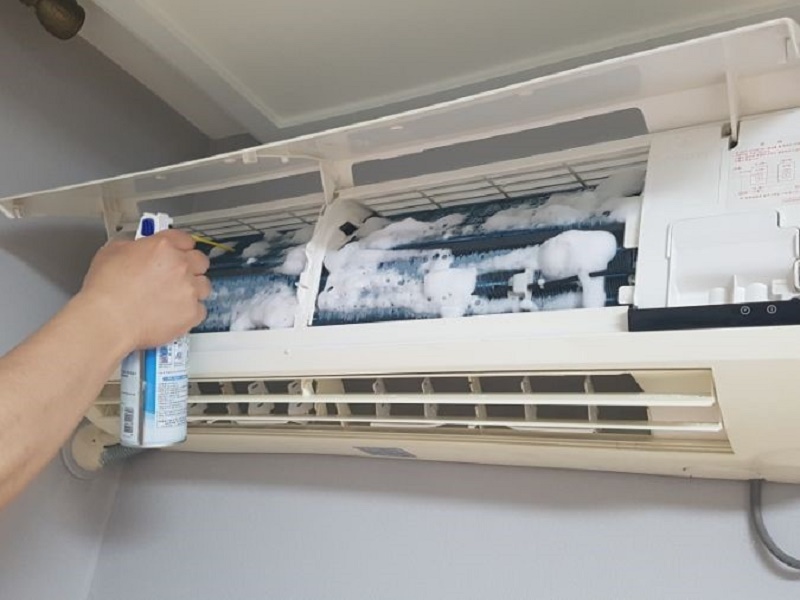 - Mở mặt trước của mặt lạnh điều hòa, tháo tấm lưới lọc bụi ra rửa sạch bằng nước, kết hợp với dùng bàn chải mềm để làm sạch các khe, rãnh, góc cạnh sau đó dùng chai xịt lên toàn bộ bề mặt dàn lạnh ở khoảng cách khoảng 5cm.