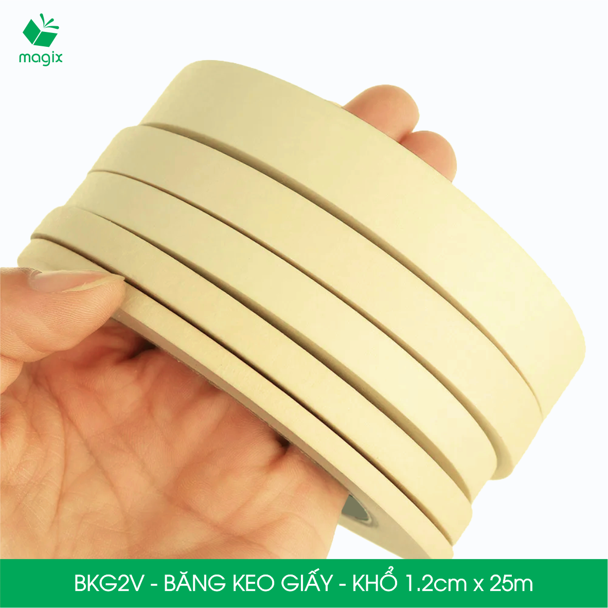 2 Cuộn Băng dính giấy cao cấp 2.5 cm Băng dính giấy là loại băng dính viết được, được sản xuất bằng chất liệu giấy kếp với lớp keo cao su hòa tan trên một