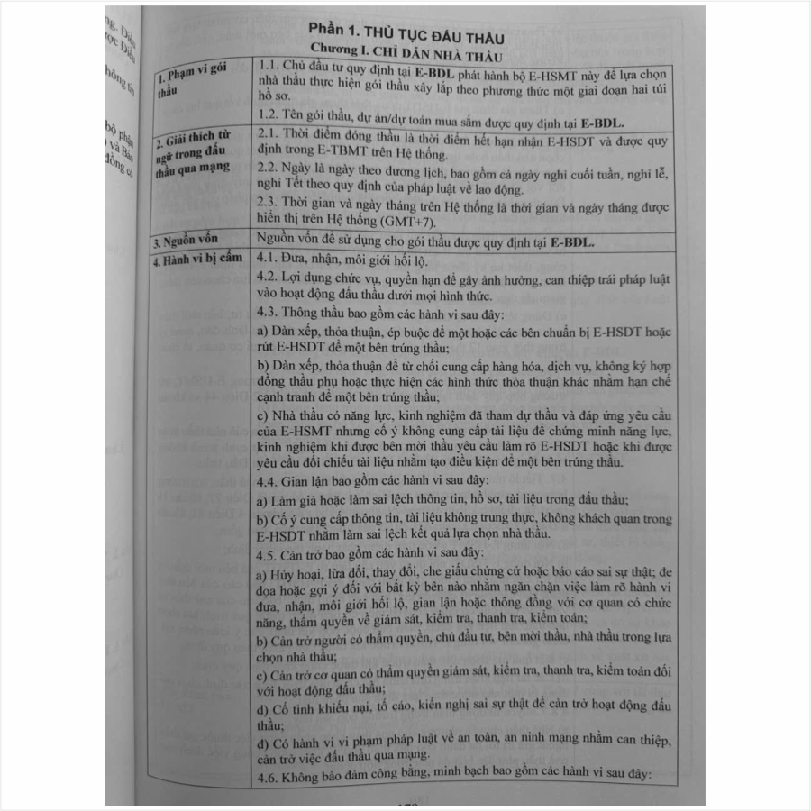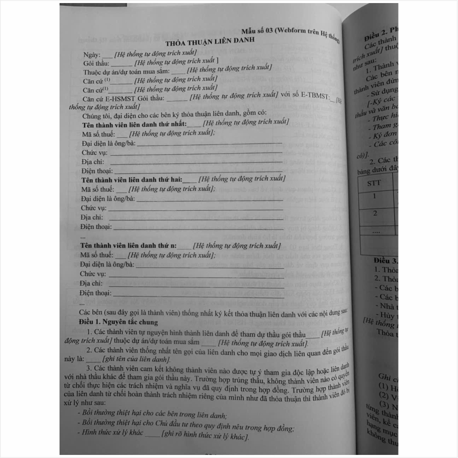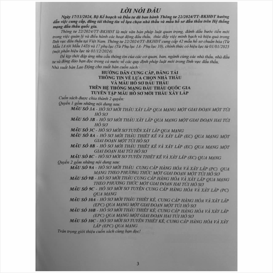 - Toàn bộ sách bìa mềm khổ lớn 20 x 28 cm phân phối bởi Nhà sách Nam Việt đều được bọc sách Plastic MIỄN PHÍ và xuất hóa đơn điện tử đầy đủ, nhanh chóng. …//… Lời giới thiệu: Ngày 17/11/2024, Bộ Kế hoạch và Đầu tư đã ban hành Thông tư số 22/2024/TT-BKHĐT hướng dẫn việc cung cấp, đăng tải thông tin về lựa chọn nhà thầu và mẫu hồ sơ đấu thầu trên Hệ thống mạng đấu thầu quốc gia. Thông tư 22/2024/TT-BKHĐT là một văn bản pháp luật quan trọng, đánh dấu bước tiến mới trong việc quản lý và điều hành các hoạt động đấu thầu, thúc đẩy việc minh bạch và hiệu quả trong lĩnh vực đấu thầu tại Việt Nam. Thông tư 22/2024/TT-BKHĐT cung cấp 42 mẫu hồ sơ chuẩn hóa (Từ Mẫu 1A tới Mẫu 14D) và 17 phụ lục (Từ Phụ lục 1A- Phụ lục 10), chính thức có hiệu lực từ 01/01/2025 (một phần hiệu lực từ 01/12/2024). Để kịp thời đáp ứng nhu cầu thông tin của các cơ quan, ban, ngành cùng các nhà thầu, nhà đầu tư và đông đảo bạn đọc trong cả nước về các quy định pháp luật mới trong lĩnh vực đấu thầu, Nhà sách Nam Việt xin trân trọng giới thiệu bộ 2 cuốn sách Đấu Thầu mới 2024: Hướng Dẫn Cung Cấp, Đăng Tải Thông Tin về Lựa chọn Nhà Thầu và Mẫu Hồ Sơ Đấu Thầu Trên Hệ Thống Mạng Đấu Thầu Quốc Gia – Thông tư 22/2024/TT-BKHĐT …//… Nội dung quyển 1 gồm các nội dung sau: MẪU SỐ 3A. Hồ Sơ Mời Thầu Xây Lắp Qua Mạng Một Giai Đoạn Một Túi Hồ Sơ MẪU SỐ 3B. Hồ Sơ Mời Thầu Xây Lắp Qua Mạng Một Giai Đoạn Hai Túi Hồ Sơ MẪU SỐ 3C. Hồ Sơ Mời Sơ Tuyển Xây Lắp Qua Mạng MẪU SỐ 8A. Hồ Sơ Mời Thầu Thiết Kế Và Xây Lắp (EC) Qua Mạng Một Giai Đoạn Một Túi Hồ Sơ MẪU SỐ 8B. Hồ Sơ Mời Thầu Thiết Kế Và Xây Lắp (EC) Qua Mạng Một Giai Đoạn Hai Túi Hồ Sơ MẪU SỐ 8C. Hồ Sơ Mời Sơ Tuyển Thiết Kế Và Xây Lắp (EC) Qua Mạng …//… Nội dung cuốn tập 2 có các phần sau: MẪU SỐ 9A. Hồ Sơ Mời Thầu Cung Cấp Hàng Hóa Và Xây Lắp (PC) Qua Mạng Theo Phương Thức Một Giai Đoạn Một Túi Hồ Sơ MẪU SỐ 9B. Hồ Sơ Mời Thầu Cung Cấp Hàng Hóa Và Xây Lắp Qua Mạng Theo Phương Thức Một Giai Đoạn Hai Túi Hồ Sơ MẪU SỐ 9C. Hồ Sơ Mời Sơ Tuyển Cung Cấp Hàng Hóa Và Xây Lắp (PC) Qua Mạng MẪU SỐ 10A. Hồ Sơ Mời Thầu Thiết Kế, Cung Cấp Hàng Hóa Và Xây Lắp (EPC) Qua Mạng Một Giai Đoạn Một Túi Hồ Sơ MẪU SỐ 10B. Hồ Sơ Mời Thầu Thiết Kế, Cung Cấp Hàng Hóa Và Xây Lắp (EPC) Qua Mạng Một Giai Đoạn Hai Túi Hồ Sơ MẪU SỐ 10C. Hồ Sơ Mời Sơ Tuyển Thiết Kế, Cung Cấp Hàng Hóa Và Xây Lắp (EPC) Qua Mạng .../... Cảm ơn các bạn đã ghé thăm shop Nhà sách Nam Việt ! Sách Hướng Dẫn Cung Cấp, Đăng Tải Thông Tin về Lựa chọn Nhà Thầu và Mẫu Hồ Sơ Đấu Thầu Trên Hệ Thống Mạng Đấu Thầu Quốc Gia – Thông tư 22/2024/TT-BKHĐT Sách Hướng Dẫn Cung Cấp, Đăng Tải Thông Tin về Lựa chọn Nhà Thầu và Mẫu Hồ Sơ Đấu Thầu Trên Hệ Thống Mạng Đấu Thầu Quốc Gia – Thông tư 22/2024/TT-BKHĐT