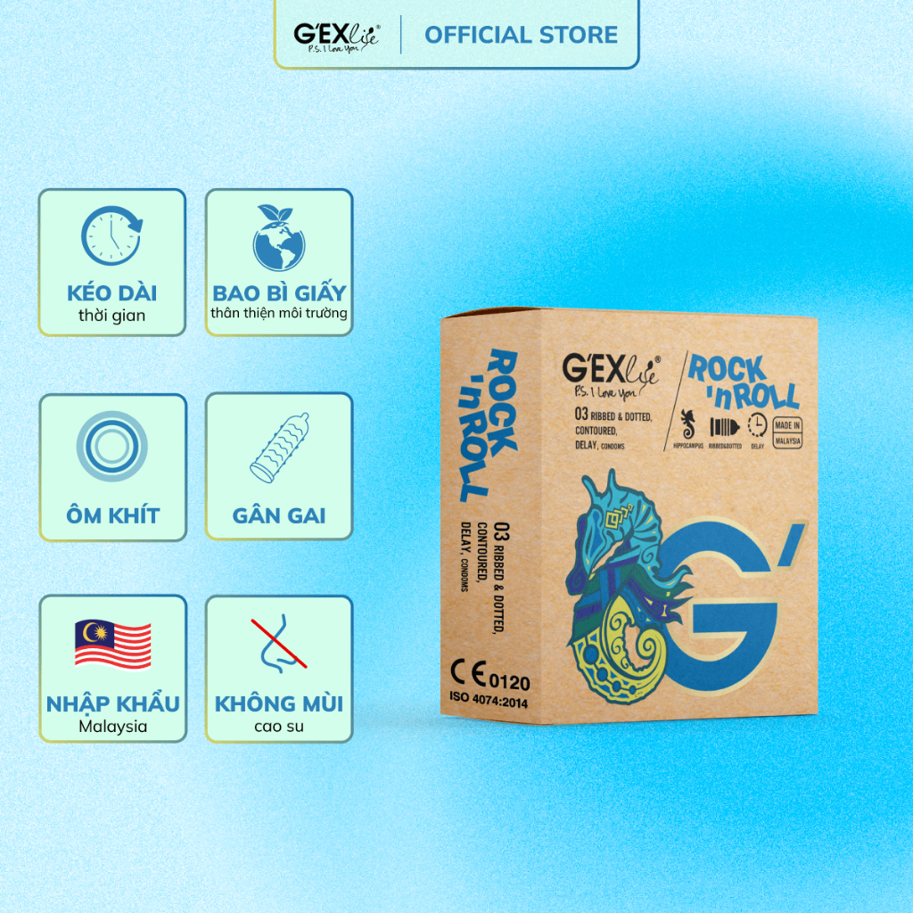 - BCS sản xuất tại nhà máy BCS Top thế giới tại Malaysia. CÔNG DỤNG: Thiết kế ôm khít, có các siêu hạt và vòng gân nổi ở những vị trí đặc biệt, chứa Benzocaine, G’EXlife Rock'nRoll không chỉ kéo dài thời gian, gia tăng khoái cảm mà còn đem lại thăng hoa cho cả hai. THÀNH PHẦN CHÍNH: Cao su thiên nhiên trong suốt ĐỐI TƯỢNG SỬ DỤNG: Dành cho người từ 18 tuổi trở lên. HƯỚNG DẪN SỬ DỤNG: