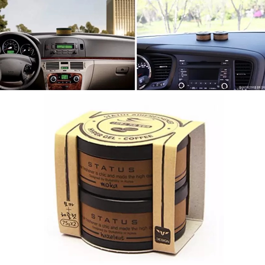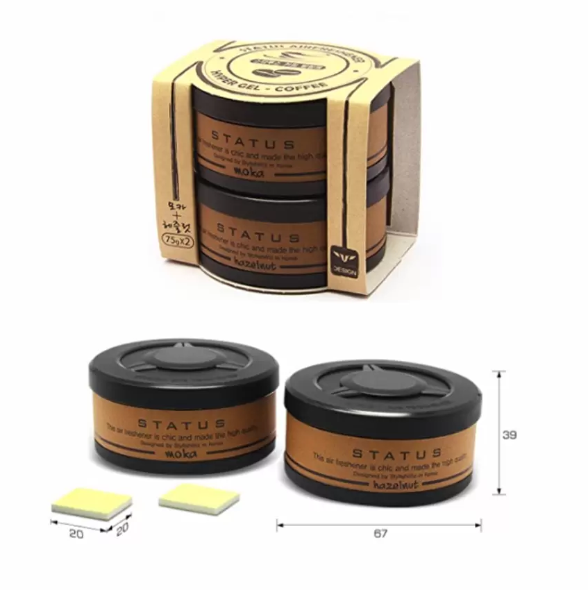 THÔNG TIN SẢN PHẨM Tên sản phâm : Sáp thơm khử mùi cho ô tô Status Korea CÔng dụng : Giúp khử mùi hôi ,thư thái tinh thần, chống say xe Thành phần : Cafe nguyên chất , chất tạo dẻo Hướng dẫn sử dụng : Tháo nắp bỏ lớp giấy bạc bảo quản , Để nơi mình muốn Hướng dẫn bảo quản : Bảo quản nơi khô ráo, thoáng mát Bộ sản phẩm : Gồm 2 hộp gel 60g hương cafe nguyên chất Hazelnut & Moka Quy cách đóng gói : Hộp x 2 Kích thước vỉ : D7,5 x R7 x C6,5 Cm Mùi hương : Moka và Hazelnut đặc biệt Màu sắc : Nâu Xuất xứ : Made In Korea Trọng lượng : 200 (g)
