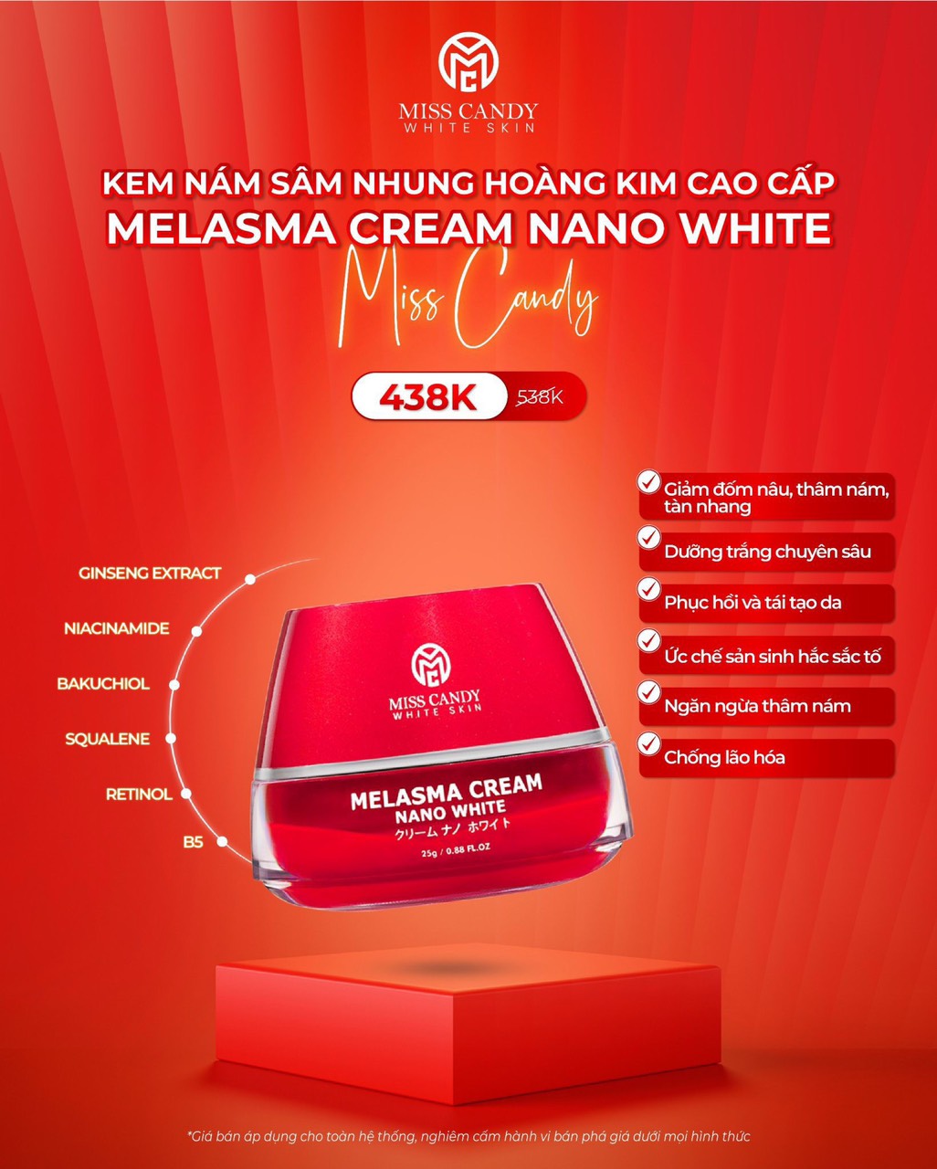 - Kem Dưỡng Trắng Da Mờ Thâm Nám Sâm Nhung Hoàng Kim Cao Cấp Melasma Cream Nano White MISS CANDY 25g: