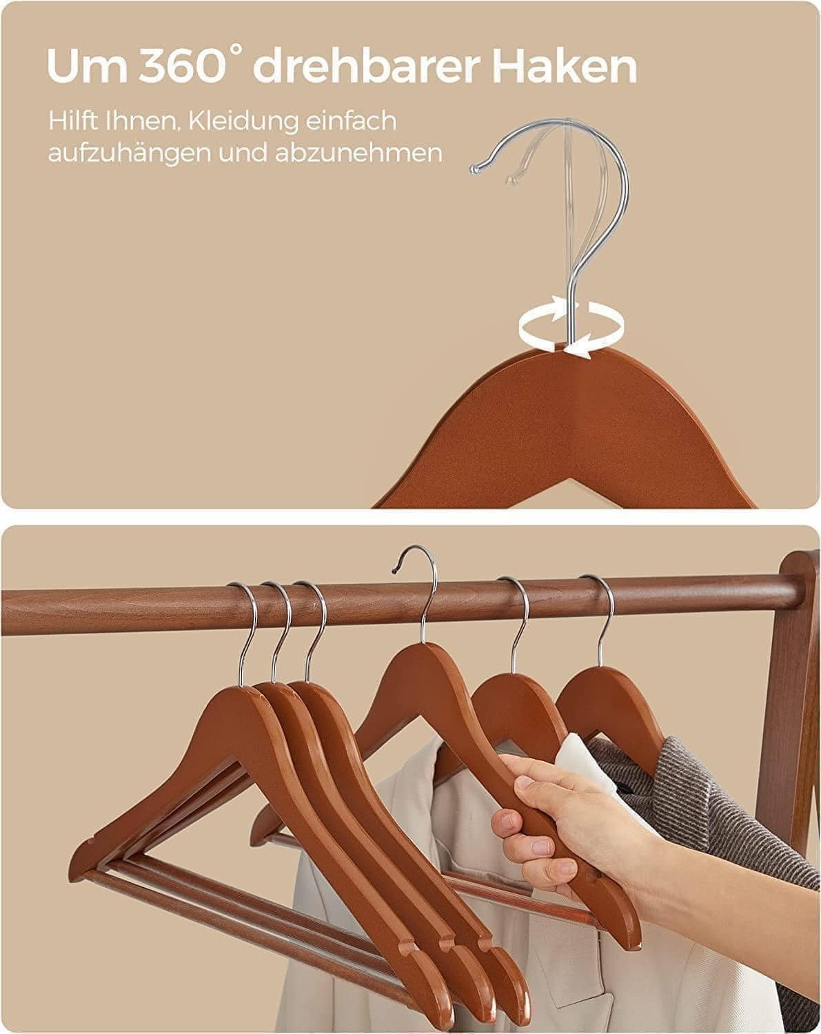 Một món đồ bắt mắt trong tủ quần áo của bạn: trên những chiếc móc treo này, gây ấn tượng với màu óc chó sẫm và bề mặt nhẵn dễ chịu, những bộ quần áo của bạn luôn trông như mới mua và luôn sẵn sàng để sử dụng.