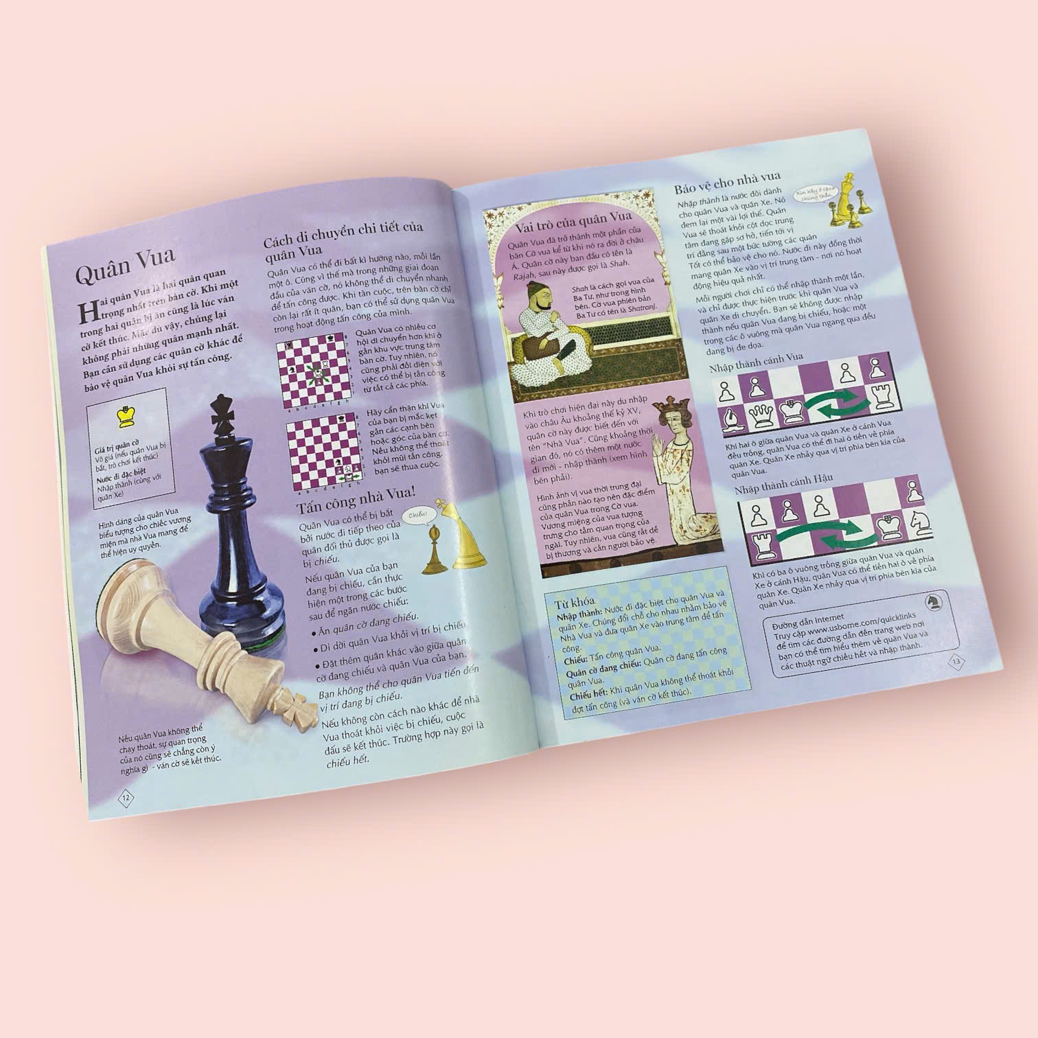 - “CỜ VUA – NHỮNG BƯỚC ĐI ĐẦU TIÊN CỦA KIỆN TƯỚNG” là một tài liệu tuyệt vời với hơn 80 chủ đề cơ bản, từ khai cuộc đến trung cuộc và tàn cuộc. Cuốn sách cung cấp hướng dẫn chi tiết và minh họa sinh động về lịch sử cũng như các kỹ thuật và chiến thuật cờ vua, phù hợp cho mọi lứa tuổi, đặc biệt là những người mới bắt đầu và những ai muốn nâng cao lối chơi của mình. Ngoài ra, sách còn chứa đựng nhiều mẹo hay để thiết lập những cái bẫy đầy bất ngờ, tính toán các nước đi khéo léo, tấn công hiệu quả và bảo vệ quân cờ, nhằm đạt được chiến thắng tối ưu. Thêm vào đó, nhiều câu đố thú vị sẽ thử thách trí tuệ của bé, với đáp án được công bố ở cuối mỗi trang.