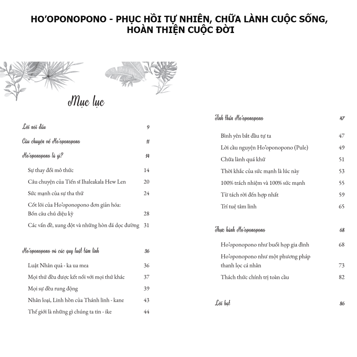 Tất cả chúng ta đang bước Trên một hành trình chung. Chữa lành bản thân, Và chữa lành thế giới, Cảm ơn bạn! Ho’oponopono là một nghi thức chữa lành của người Hawaii cổ bằng việc dạy con người hướng đến sự tha thứ. Trong đó, Ho’o có nghĩa là tạo ra và pono có nghĩa là sự đúng đắn. Chữ pono được lặp lại hai lần với hàm ý hướng đến bản thân và cả những người xung quanh mình. Hãy hình dung bạn đang cầm trong mỗi bên tay một viên đá lớn. Nếu ngay bây giờ tôi muốn đưa cho bạn một số tiền, trước tiên bạn phải đặt viên đá xuống. Cũng tương tự như thế với các khuôn mẫu và định kiến của chúng ta, các giá trị của chúng ta và các món quà của vũ trụ. Chìa khóa để có thể tiếp nhận nằm ở khả năng buông bỏ điều gì đó, với niềm tin rằng ta sẽ không bị hại hoặc không vì thế mà thua thiệt Ho’oponopono là gì? Ho’oponopono là một phương pháp thanh lọc tâm linh hồn giúp chúng ta gột sạch hết những nỗi sợ hãi và lo lắng, những khuôn mẫu quan hệ tàn hại, cũng như bất kỳ giáo điều và mô thức tôn giáo nào chống đối sự phát triển cá nhân và tâm linh của chúng ta. Nó làm sạch những tắc nghẽn trong suy nghĩ và cấu trúc tế bào của chúng ta, vì suy nghĩ của chúng ta được thể hiện trong cơ thể. Đây là sự thay đổi mô thức. Phương pháp này có nguồn gốc từ Hawaii và dựa trên hiểu biết rằng chúng ta đang sống trong một vũ trụ phong phú, và Thánh thần, muốn ta tận hưởng sự phong phú và hoàn hảo ấy. Tuy nhiên, thứ đang cản trở chúng ta trải nghiệm sự phong phú thực sự, cảm giác về sự thống nhất yêu thương, sự giàu có bên trong, sự phát triển tâm linh và sức khỏe hoàn hảo lại chính là chúng ta. Ho’oponopono thiên về thực hành và trong khi đọc cuốn sách nhỏ này, bạn đã có thể bắt đầu tháo gỡ nút thắt Gordian1 trong tim, sẵn sàng định hình lại thế giới tươi mới cho mình. Cách thực hiện nghi thức Ho’oponopono qua 4 bước Trước hết, bạn hãy tập trung vào một cá nhân hay sự việc nào đó khiến bạn tức giận. Sự việc đó có thể diễn ra ngay tại thời điểm này hoặc đã diễn ra từ rất lâu trong quá khứ. Đây là quá trình bạn tha thứ cho cả chính mình lẫn những người đã gây nên cho bạn những cảm xúc tiêu cực.