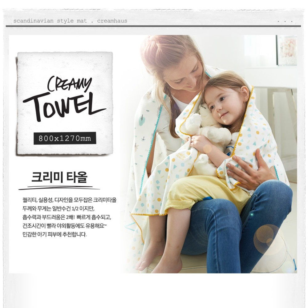 Khăn tắm Creamy của hãng Creamhaus là sản phẩm khăn tắm đa năng siêu mềm mại được sản xuất 100% tại Hàn Quốc từ nguyên liệu cho đến sản xuất. Khăn tắm Creamy được cấu tạo từ vật liệu microfiber, vật liệu có tính năng thấm hút gấp 5 lần Cotton thông thường khiến cho chiếc khăn vô cùng nhẹ nhưng vô cùng mềm mại mà hoàn toàn không gây kích ứng da cho bé. Các mẹ có thể cảm nhận ngay được rằng chỉ cần khoác lên bé chiếc khăn ngay sau khi bé tắm xong, mẹ đã có cảm giác bé khô thoáng và mềm mại tức thì. Chất liệu siêu thấm, siêu nhanh khô cùng với kích thước phù hợp (80x127 cm) nên các mẹ có thể sử dụng khăn vào rất nhiều mục đích, vừa có thể làm khăn tắm cho bé, vừa làm chăn đắp cho bé ở nhà, trên xe đẩy, khăn choàng khi ngồi chơi… Hơn nữa, Creamhaus vốn nổi tiếng là Công ty có những mẫu thiết kế đẹp mắt, lần này đã không làm phụ lòng người hâm mộ khi cho ra đời 3 thiết kế vô cùng độc đáo của khăn tắm Creamy. Những bông tuyết ngộ nghĩnh của Snowball, những hình màu sặc sỡ của Little Pop hay những tán cây của Scan Forrest đều có thể làm cho các mẹ mê mẩn và hãnh diện với mọi người mỗi khi khoác cho bé yêu của mình chiếc khăn Creamy. Đây thực sự là một món quà tuyệt vời mà các mẹ không thể bỏ qua cho bé yêu của mình. Ngoài ra, với những mẹ thích cá tính, chiếc hộp xinh xắn của khăn cũng có thể được sử dụng để đựng bút, để hoa, đựng tiền… tạo thêm sự phong phú cho ngôi nhà của mình