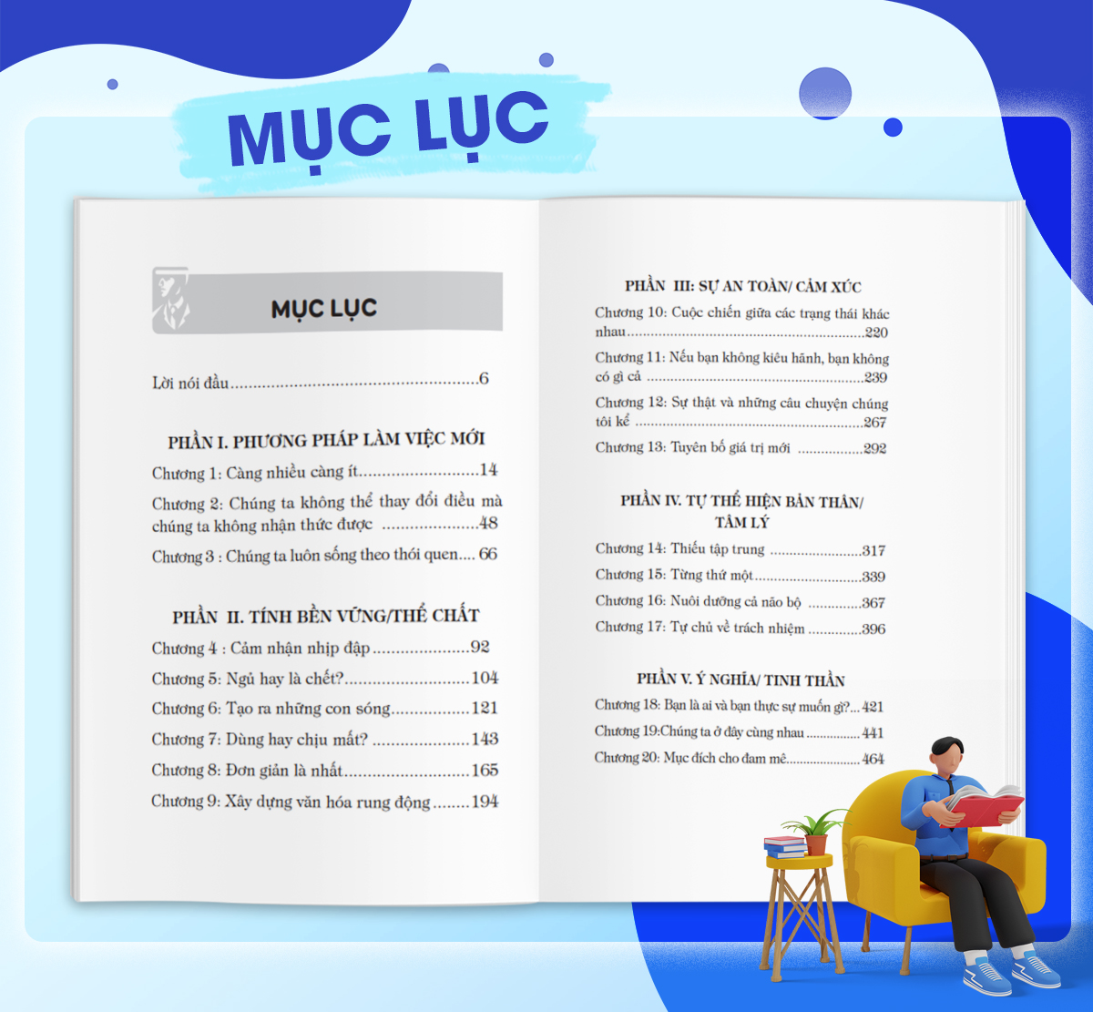 Chứa đầy những thủ thuật hành động để giúp bạn vượt qua thói quen trì hoãn trong cuộc sống và công việc, sự nghiệp. Ví dụ như: Hãy ĂN CON CÓC TRƯỚC – trước tiên hãy làm công việc khó khăn và quan trọng nhất ngay khi bạn thức giấc. Những công việc không hấp dẫn chính là “con cóc”. Đó là những công việc và dự án mà bạn không hề có động lực để làm. Chúng lơ lửng trên đầu bạn như đám mây đen cho đến khi bạn xử lý xong. Bạn càng trì hoãn bao lâu thì nó càng khiến bạn căng thẳng bấy nhiêu.