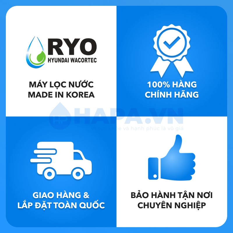 - HAPA là công ty chuyên doanh mua bán sỉ và lẻ toàn quốc các dòng sản phẩm MÁY LỌC NƯỚC RYO Hyundai nhập khẩu nguyên chiếc, chính hãng - Made in Korea.