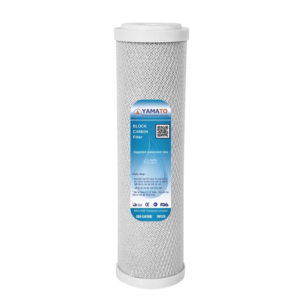 Lõi CTO 10 inch sử dụng vật liệu than hoạt tính gáo dừa tự nhiên cao cấp dạng nén (than hoạt tính được xay nhỏ sau đó ép bằng máy thủy lực thành dạng hình