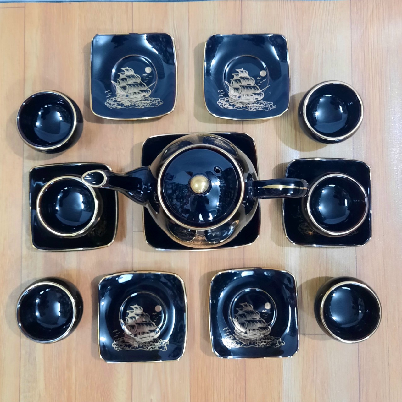 ✨Bộ ấm trà men đen vẽ vàng 24k thuận buồm xuôi gió gốm sứ Bát Tràng cao cấp