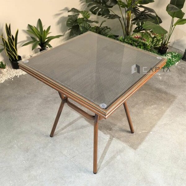 Bộ bàn cafe vuông mặt lưới Texilen ốp kính 4 ghế - Chất liệu bàn: khung nhôm, mặt bàn lưới Texilen nâu / xám, có kính cường lực trong suốt - Chất liệu ghế: Lưng