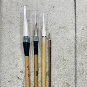 Combo bộ bút vẽ thuỷ mặc cơ bản gồm 4 cây. Cây to (kiêm hào lông hỗn hợp) vẽ lá sen, núi, thân gỗ gồ ghề. Cây lông nâu (lang hào) vẽ thân trúc, lá