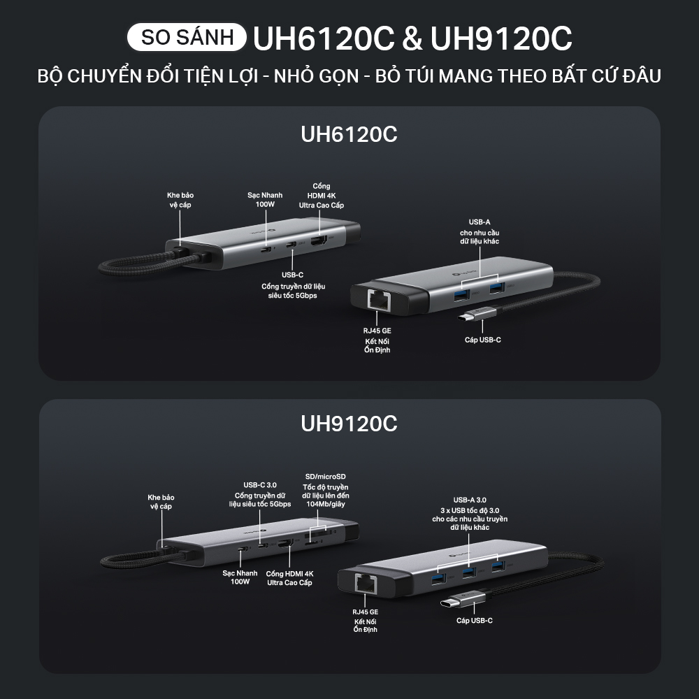 - Hub USB-C 9 trong 1: UH9120C biến một cổng USB-C duy nhất thành 9 cổng với HDMI 4K@60Hz, Ethernet 1 Gbps, SD & microSD UHS-I, sạc nhanh 100W, 1 cổng dữ liệu USB-C và 3 cổng dữ liệu USB-A.