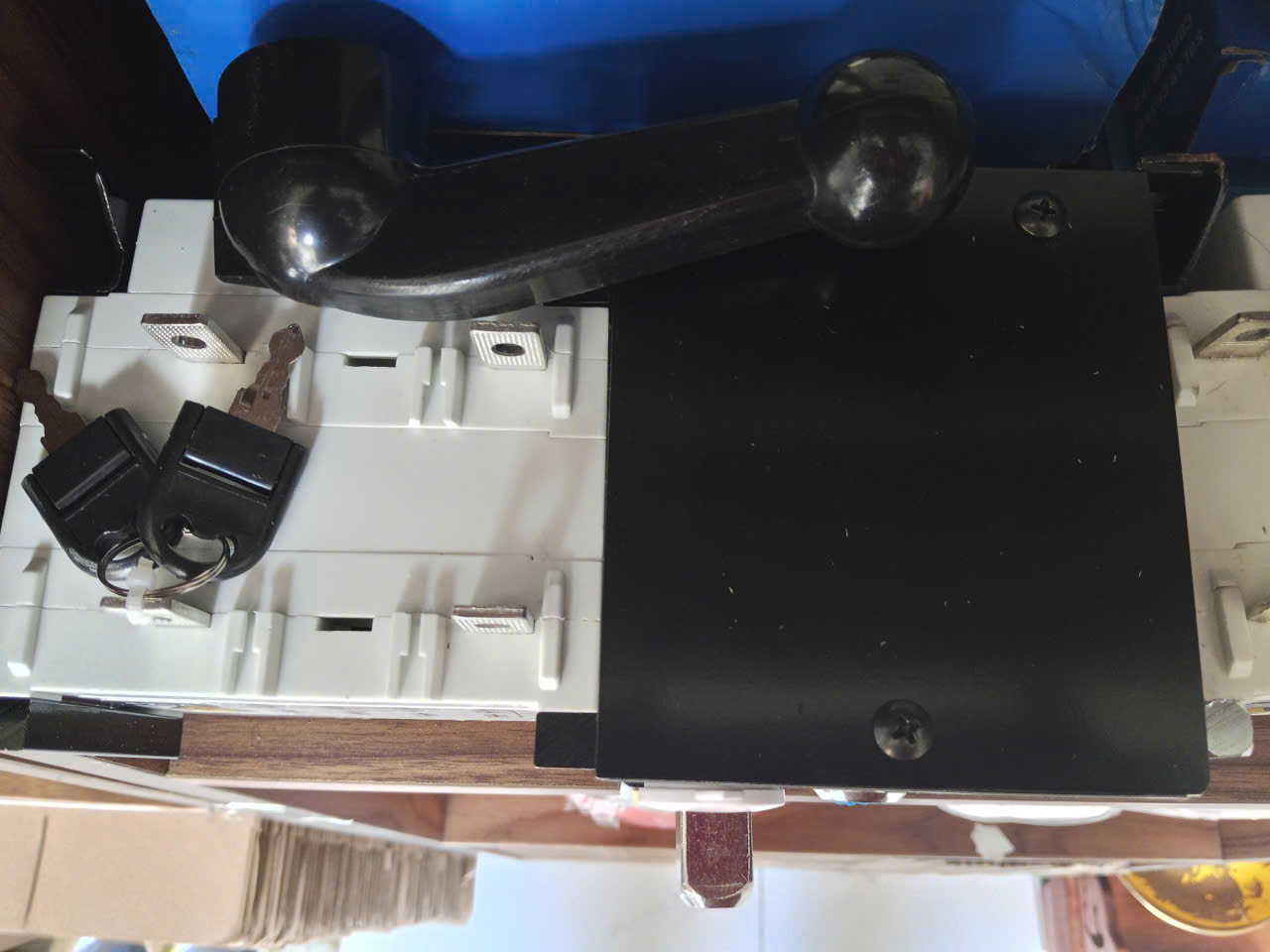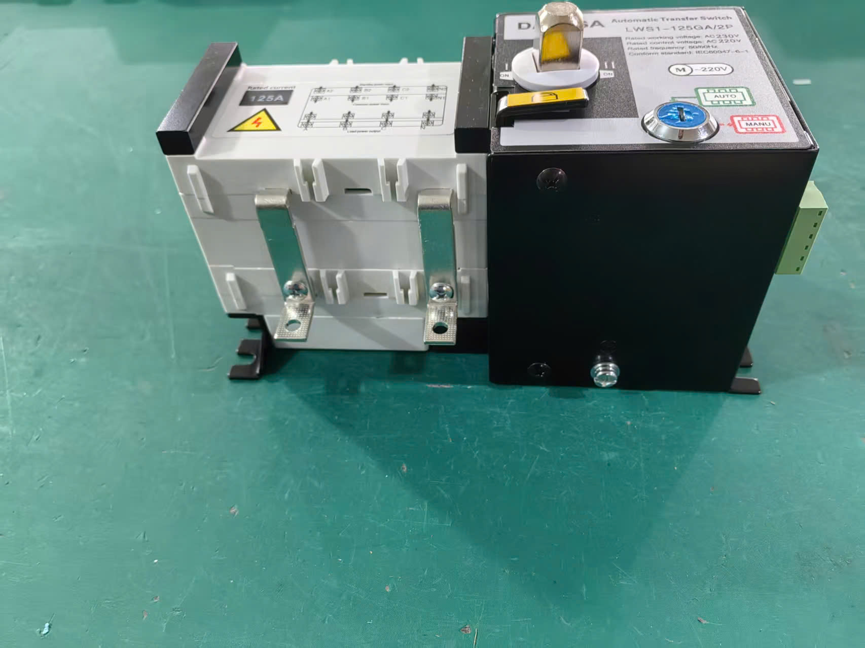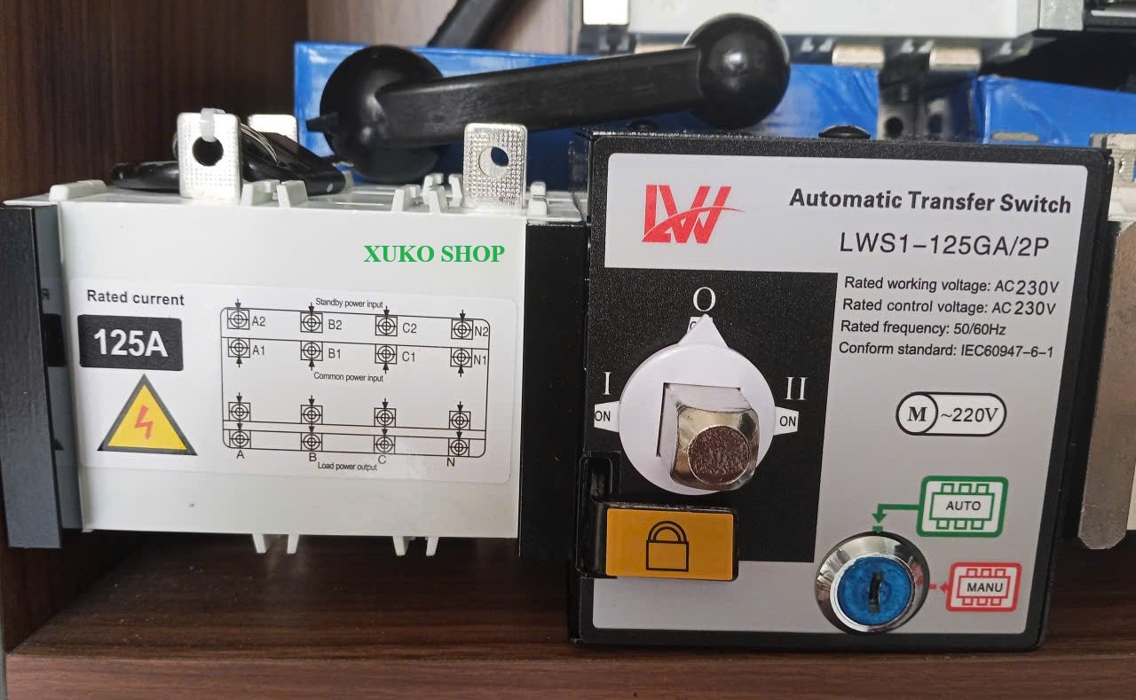 Phần cơ đóng cắt có các đầu nối dây điện lớn, cho thấy khả năng chịu dòng điện cao (125A).